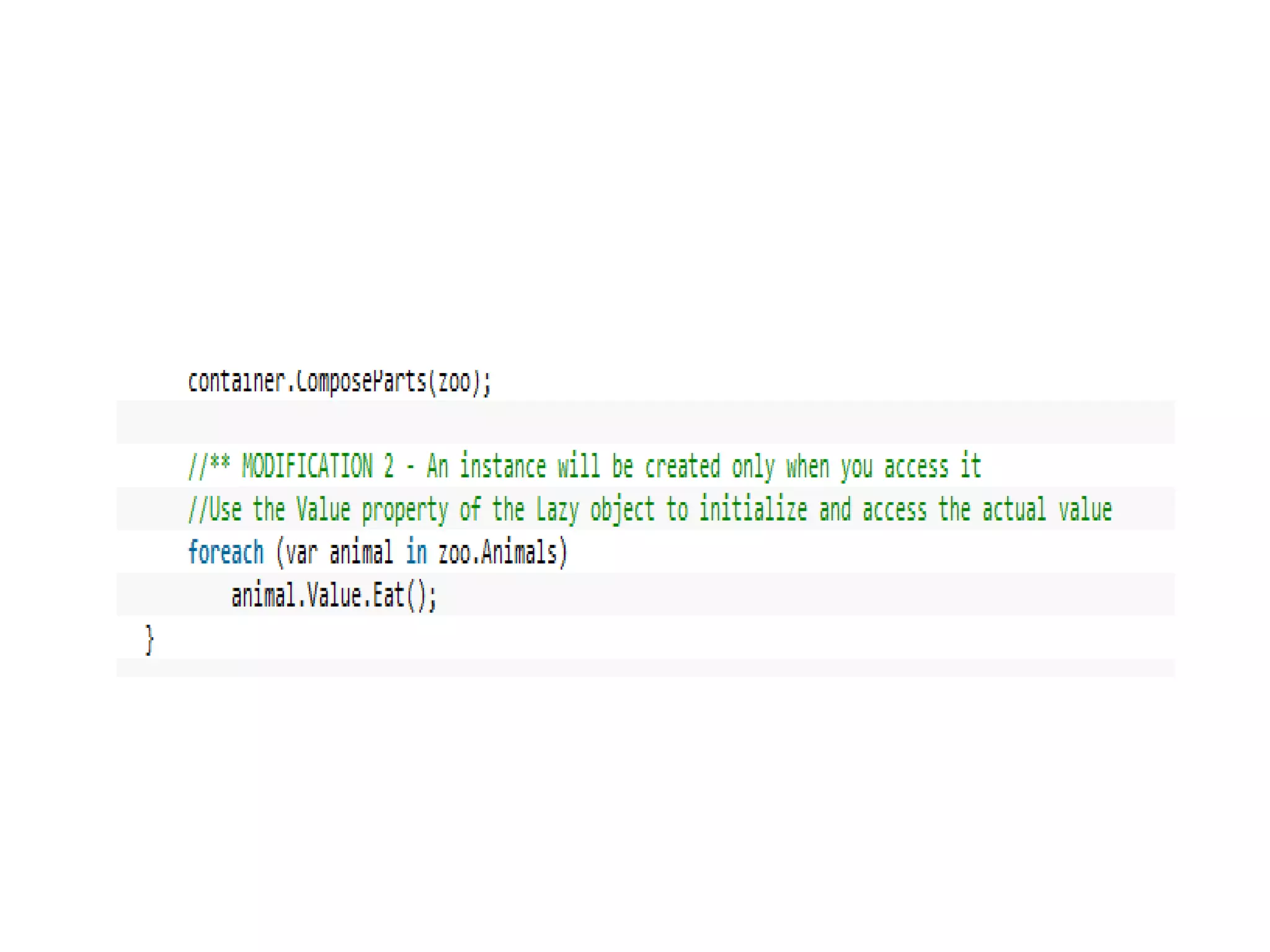 Callbacks are added to allow the zoo to call a "GiveFood" method on the animals. MEF is used to hook this up by exporting the method and importing it via a contract.