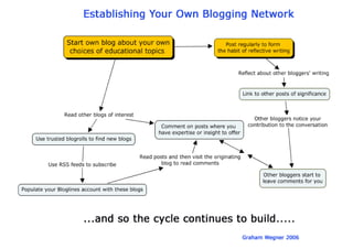 The document discusses using blogging as a form of professional learning and development for educators. It outlines some of the recurring problems with traditional professional learning models, such as lack of time and limited options. The document then proposes that blogging could help address these issues by allowing educators to access others' classroom practices, network worldwide, notice trends, and engage in exploratory discussions without constraints of time and cost. Blogging is presented as a way for educators to create their own lifelong learning networks in the digital age.