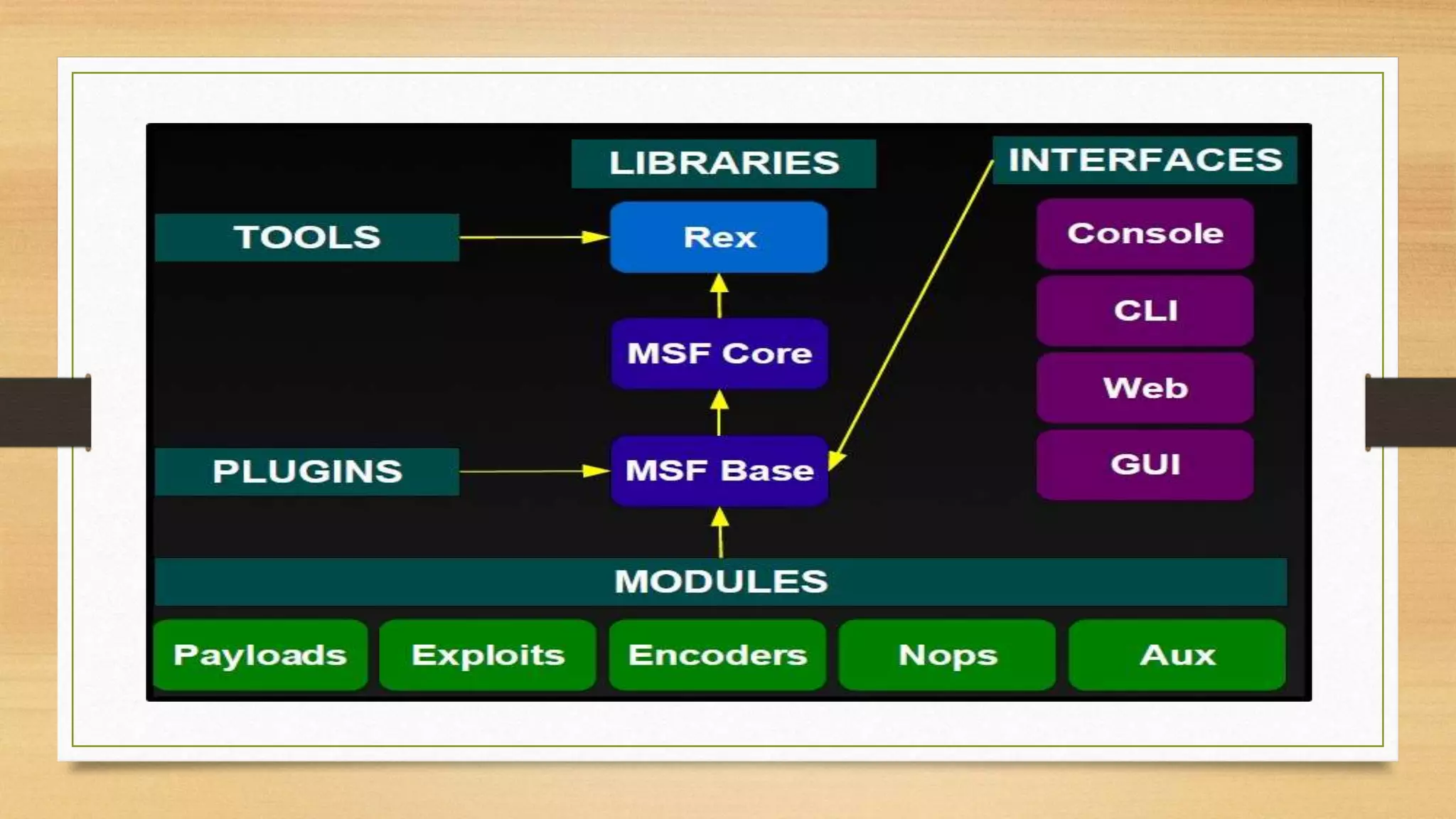 "auxiliary", "post" (post exploitation), "payloads", "encoders", and "nops.