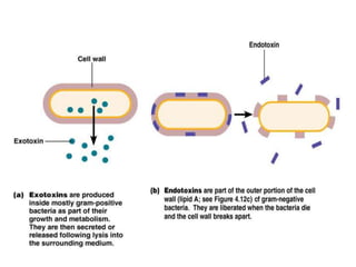 Endotoxins Source Gram– Metabolic product Present in LPS of outer membrane Chemistry Lipid Fever? Yes Neutralized by antitoxin No LD50 Relatively large