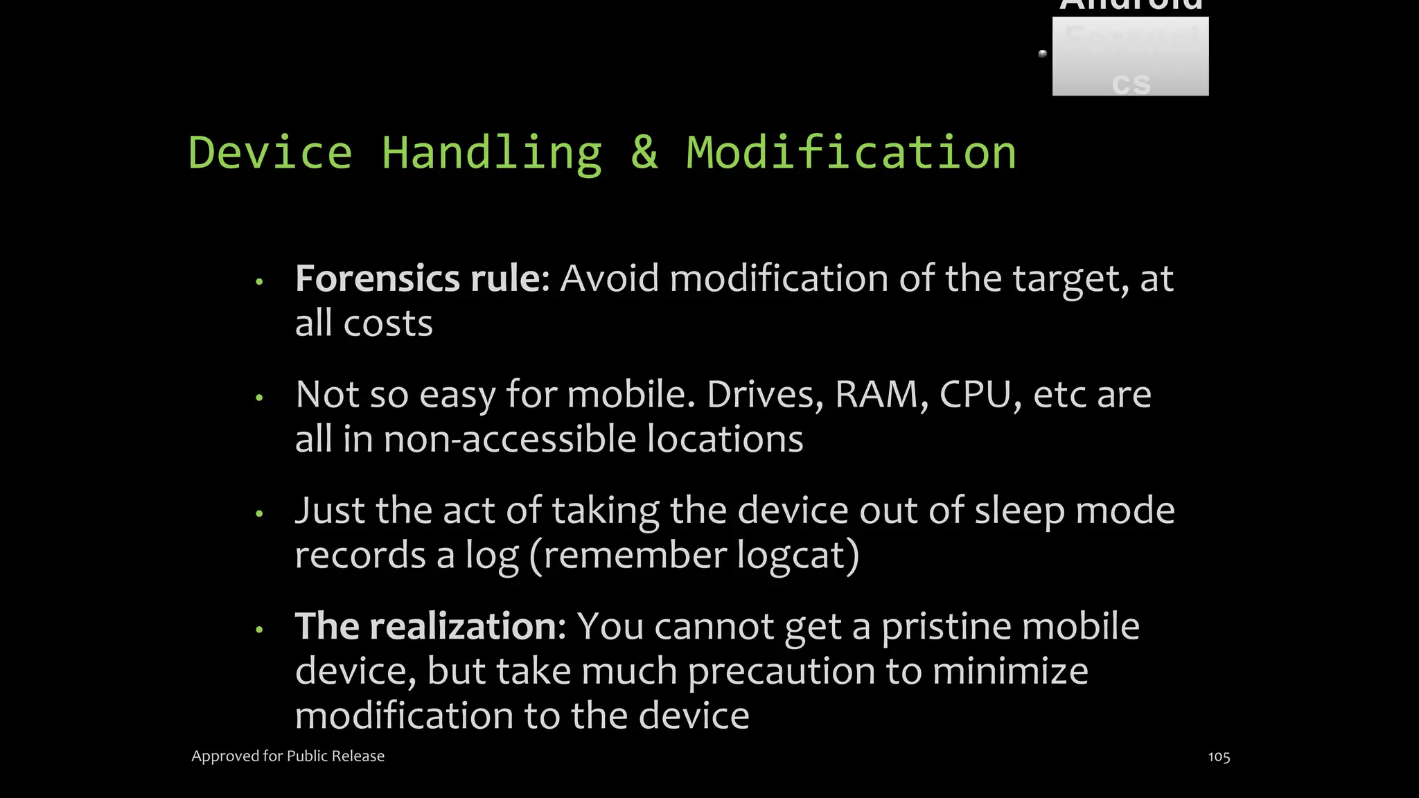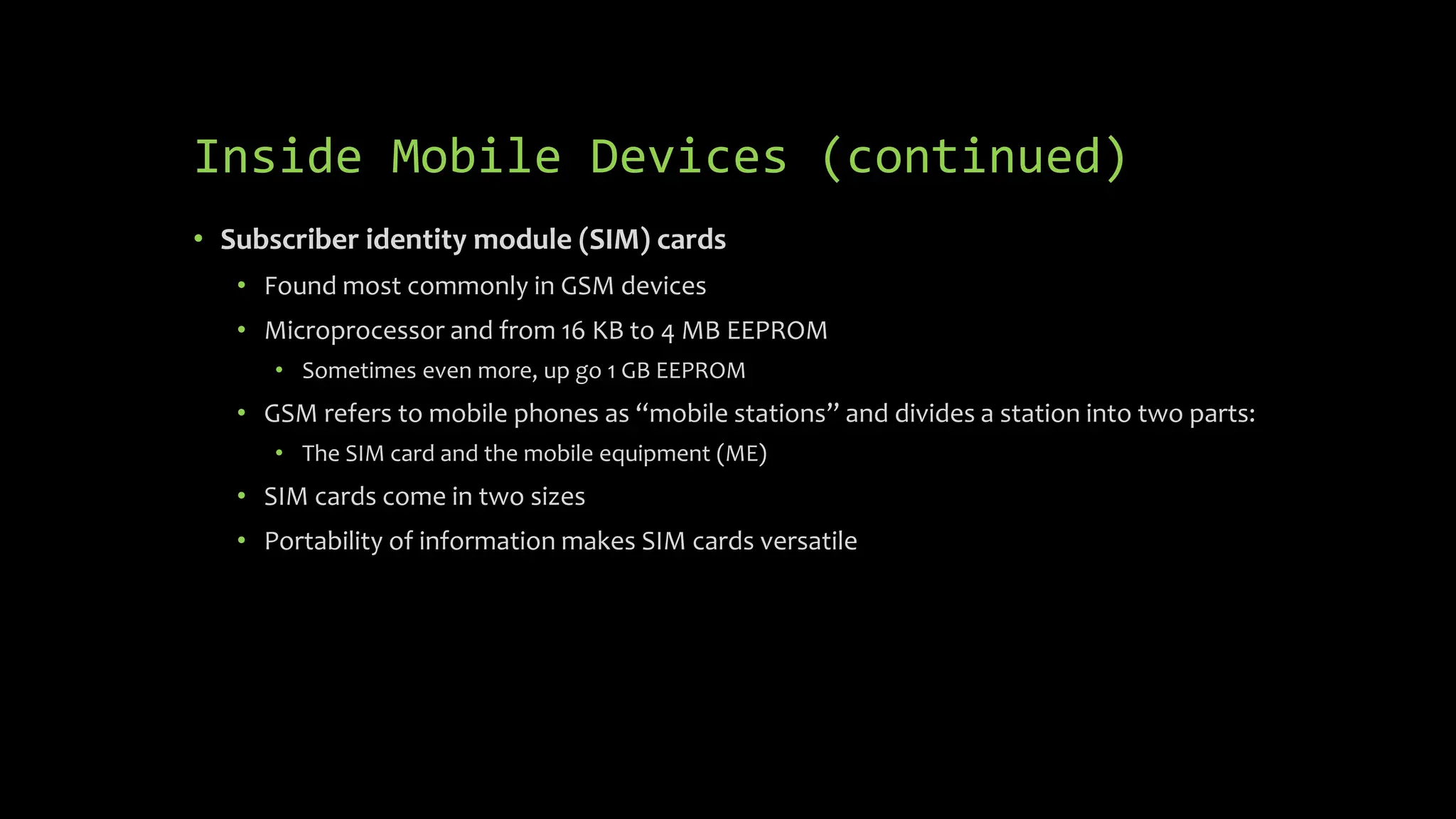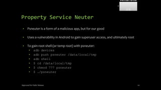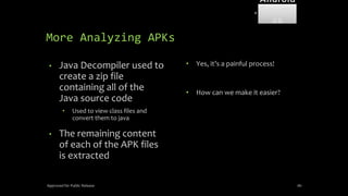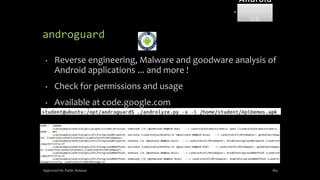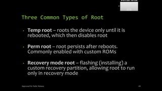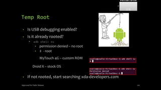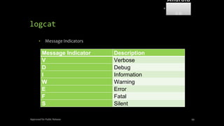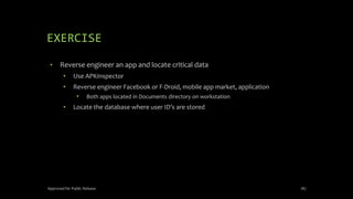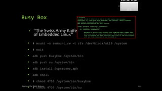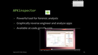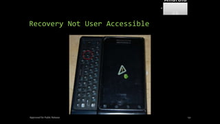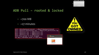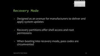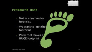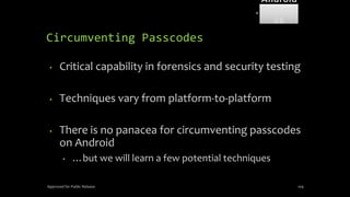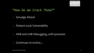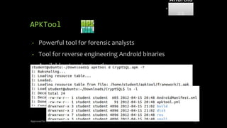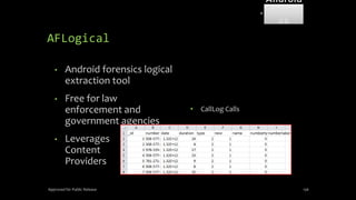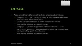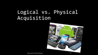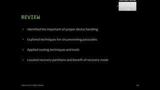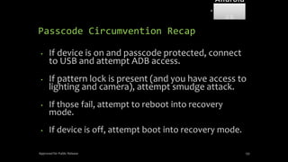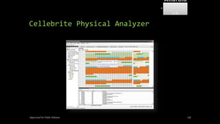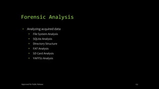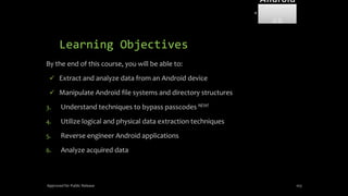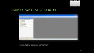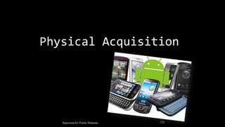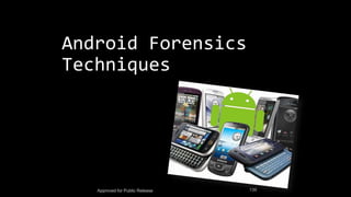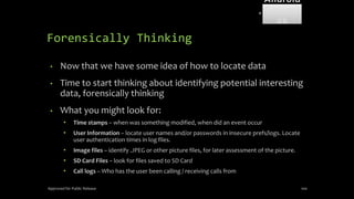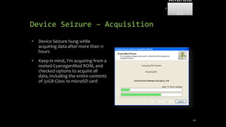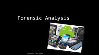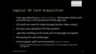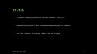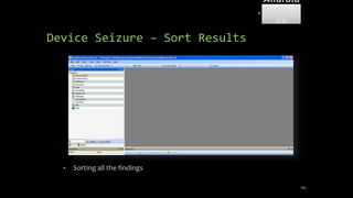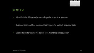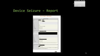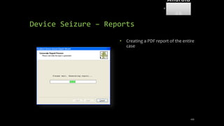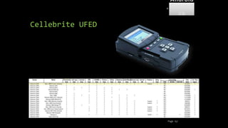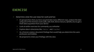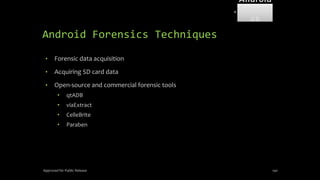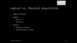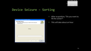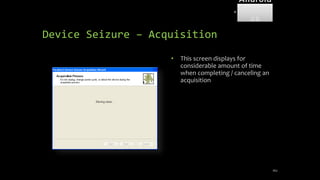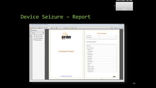 The document discusses mobile and wireless device forensics, highlighting the various types of data stored on mobile devices, the challenges of investigating these devices, and acquisition procedures for data retrieval. It covers the significance of SIM cards, personal digital assistants (PDAs), and the importance of preserving the integrity of evidence during the acquisition process. Additionally, it outlines mobile forensics equipment, techniques for data extraction, and specific considerations for Android forensics, including the role of Android Debug Bridge (ADB) in forensic analysis.