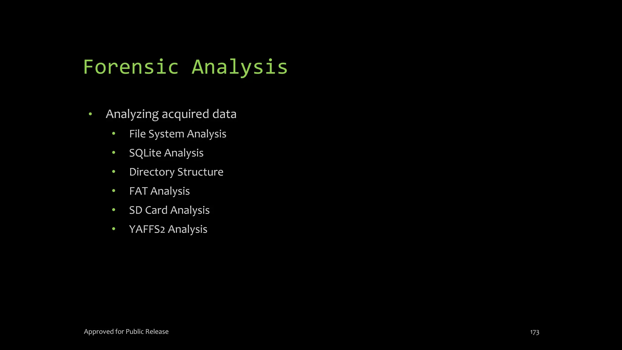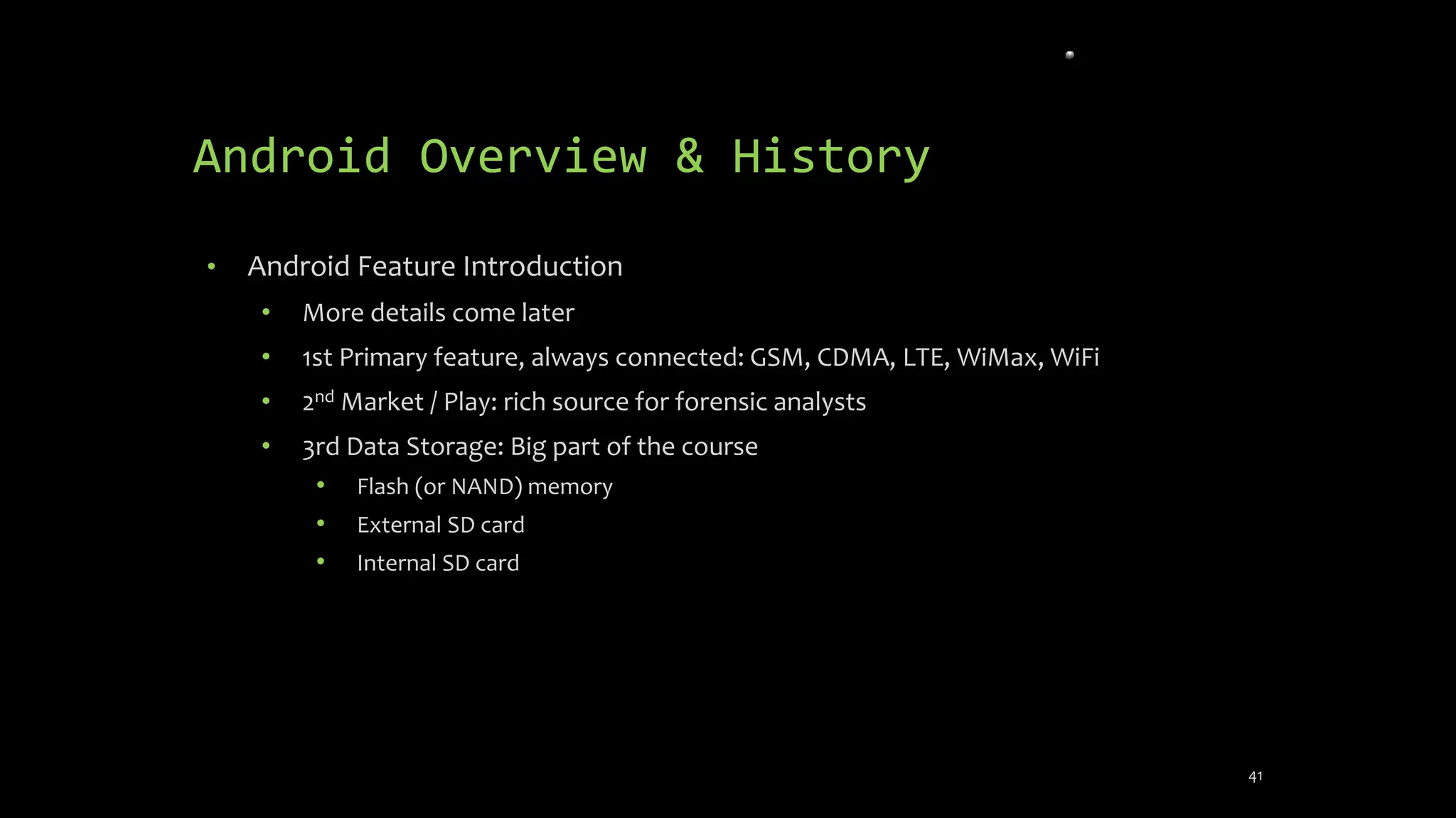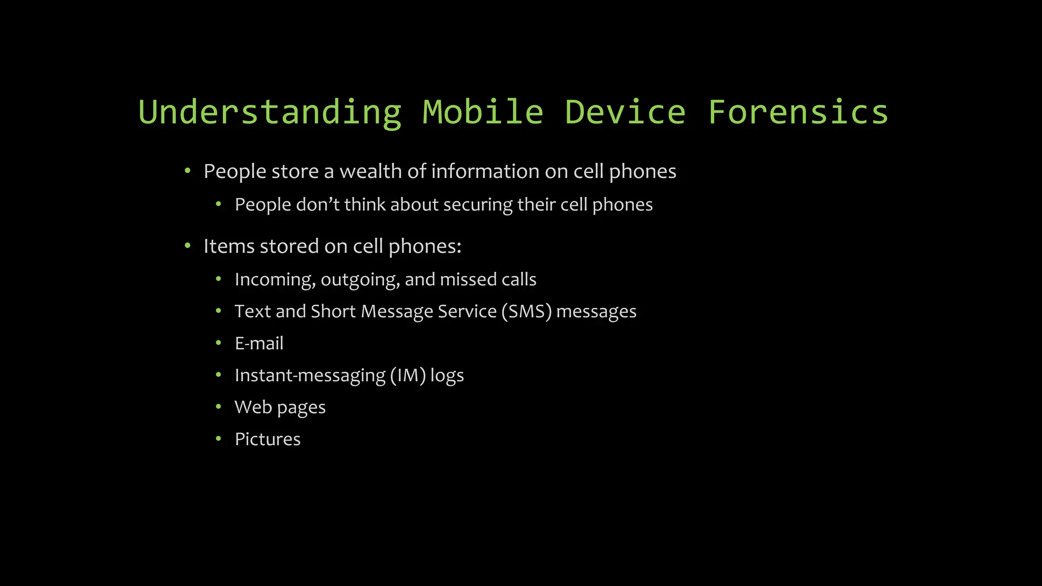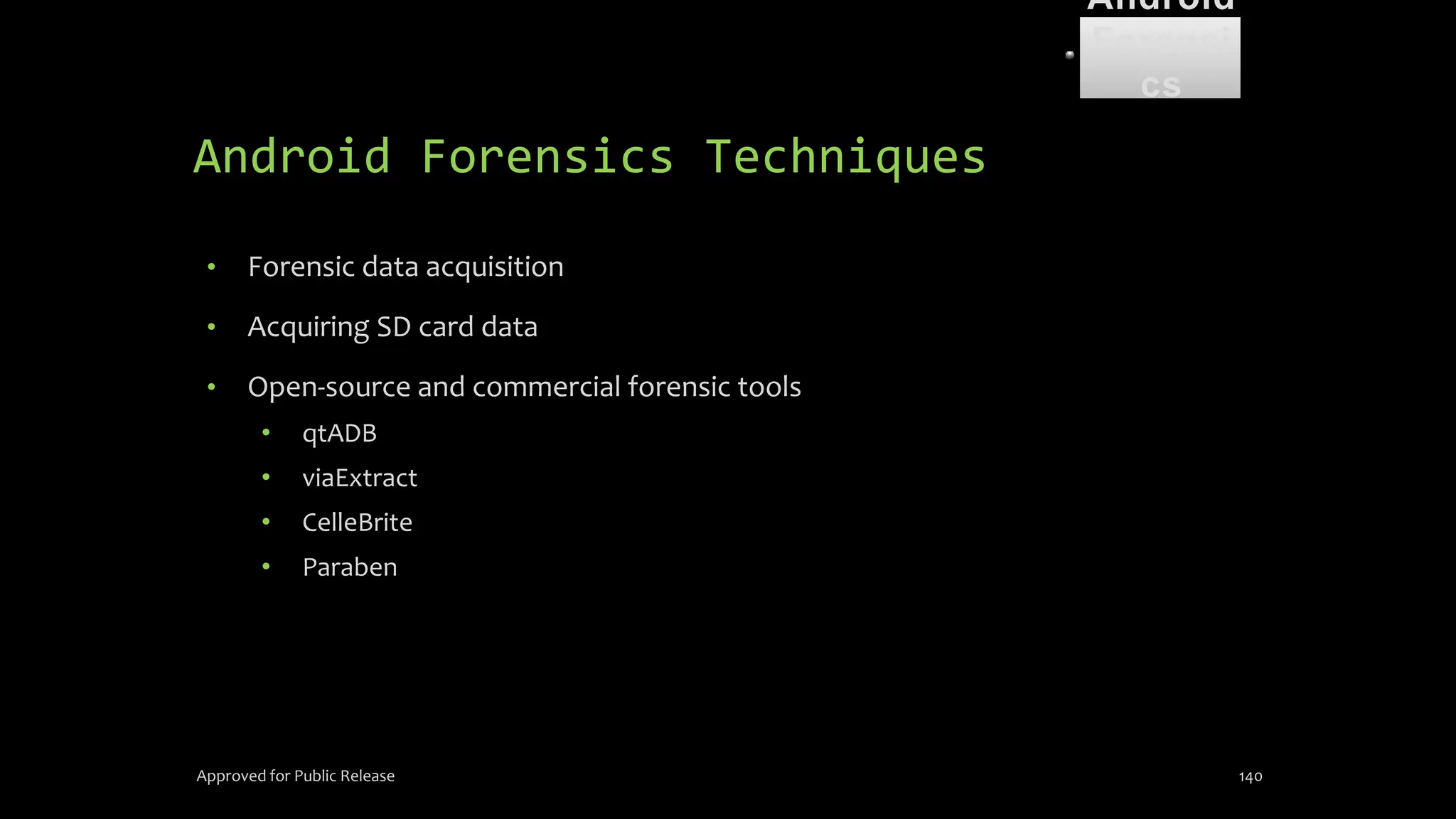 The document discusses mobile and wireless device forensics, highlighting the various types of data stored on mobile devices, the challenges of investigating these devices, and acquisition procedures for data retrieval. It covers the significance of SIM cards, personal digital assistants (PDAs), and the importance of preserving the integrity of evidence during the acquisition process. Additionally, it outlines mobile forensics equipment, techniques for data extraction, and specific considerations for Android forensics, including the role of Android Debug Bridge (ADB) in forensic analysis.