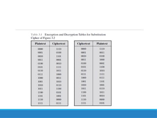 The document outlines a cryptography course, covering principles, algorithms, key management, and authentication protocols. It details various encryption techniques, including symmetric and asymmetric ciphers, alongside their security measures and methods of cryptanalysis. The syllabus includes topics like classical encryption techniques, block ciphers, substitution methods, and advanced systems such as the Hill cipher and Vigenère cipher.