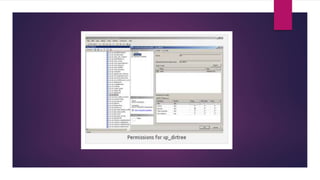 The document provides an overview of extended stored procedures in SQL Server, highlighting that they call functions from dynamic-link library (DLL) files but are deprecated in SQL Server 2012. It emphasizes the importance of disabling these procedures and understanding table privileges to prevent unauthorized data modification, following guidelines from the Centre for Internet Security (CIS). Additionally, it includes methods for identifying and assessing permissions on extended stored procedures and other database objects.