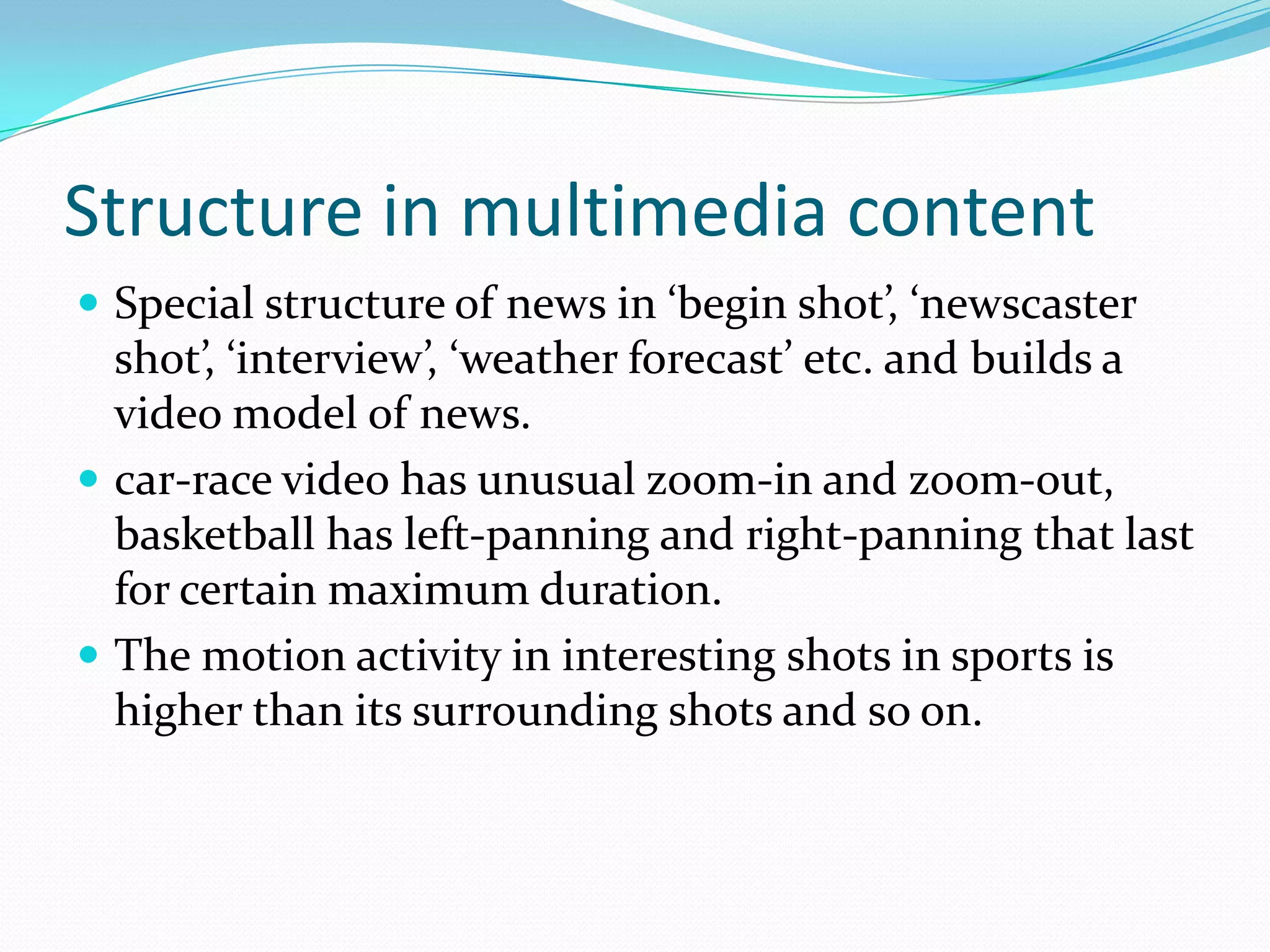 The document discusses multimedia content-based retrieval (MCBR), highlighting the challenges of interpreting complex multimedia data for effective search. It compares syntactic indexing, which relies on visual features such as color and texture, with semantic indexing that aligns more with human cognition and memory of events. The conclusion emphasizes the need for better semantic indexing methods and more efficient structures to improve content-based video indexing and retrieval systems.