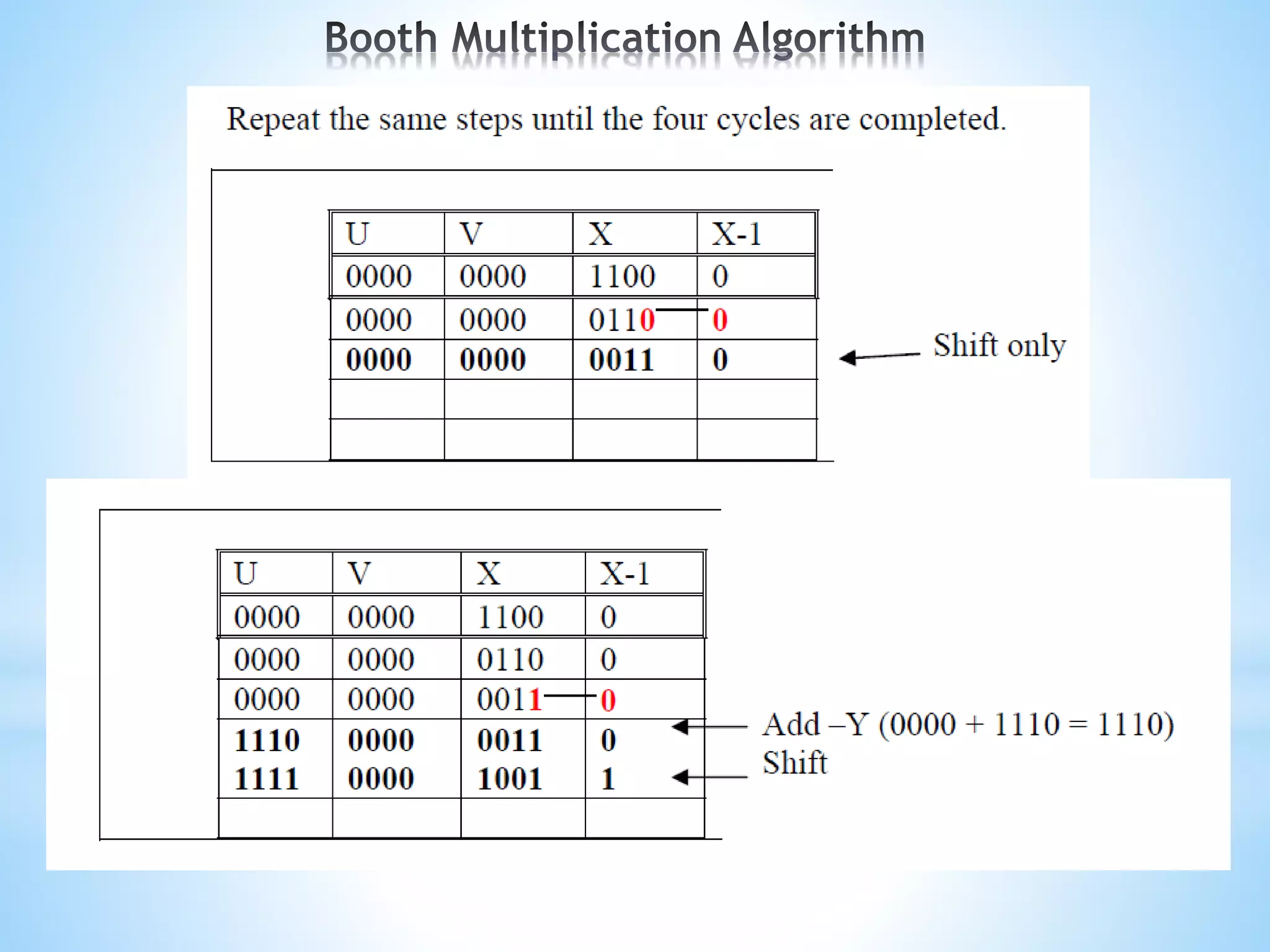 Look at the first least significant bits of the multiplier “X”, and the previous least