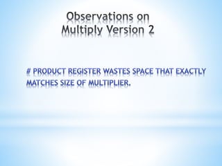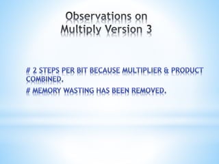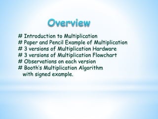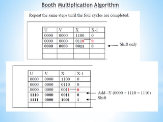 The document discusses different algorithms for multiplying binary numbers, including repeated addition, shifting registers, and the Booth algorithm. It provides examples of multiplying using these methods. The repeated addition method involves repeatedly adding the multiplicand. The shifting registers method uses separate registers for the multiplier, multiplicand, and product, and shifts and adds based on the multiplier bits. The Booth algorithm multiplies signed two's complement numbers by creating a table based on the multiplier and multiplicand, and performing additions or subtractions of the multiplicand while shifting based on the multiplier bits.