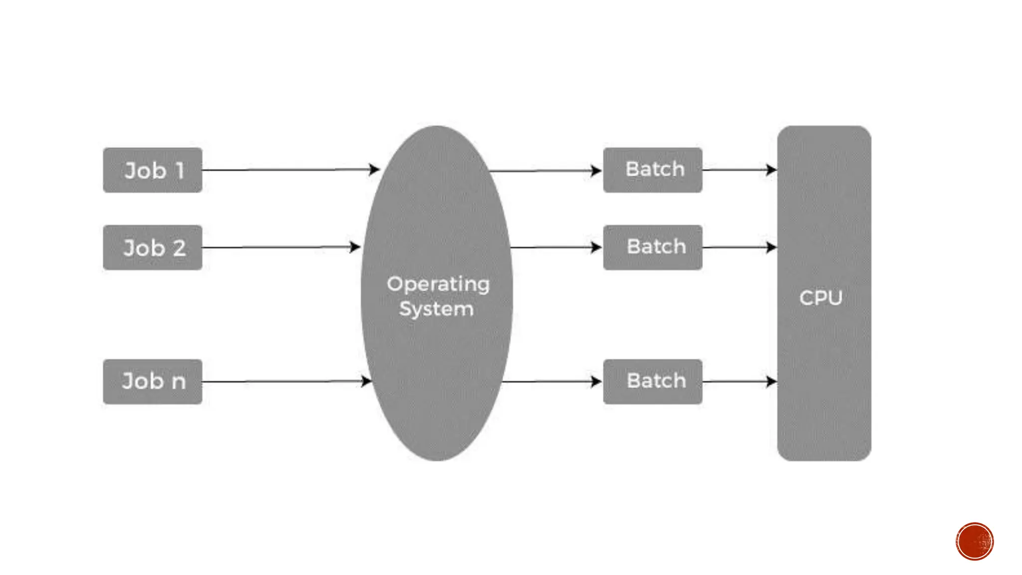 • #5 The batch operating system grouped jobs that perform similar functions. These job groups are treated as a batch and executed simultaneously. A computer system with this operating system performs the following batch processing activities: -A job is a single unit that consists of a preset sequence of commands, data, and programs. -Processing takes place in the order in which they are received, i.e., first come, first serve. -These jobs are stored in memory and executed without the need for manual information. -When a job is successfully run, the operating system releases its memory.