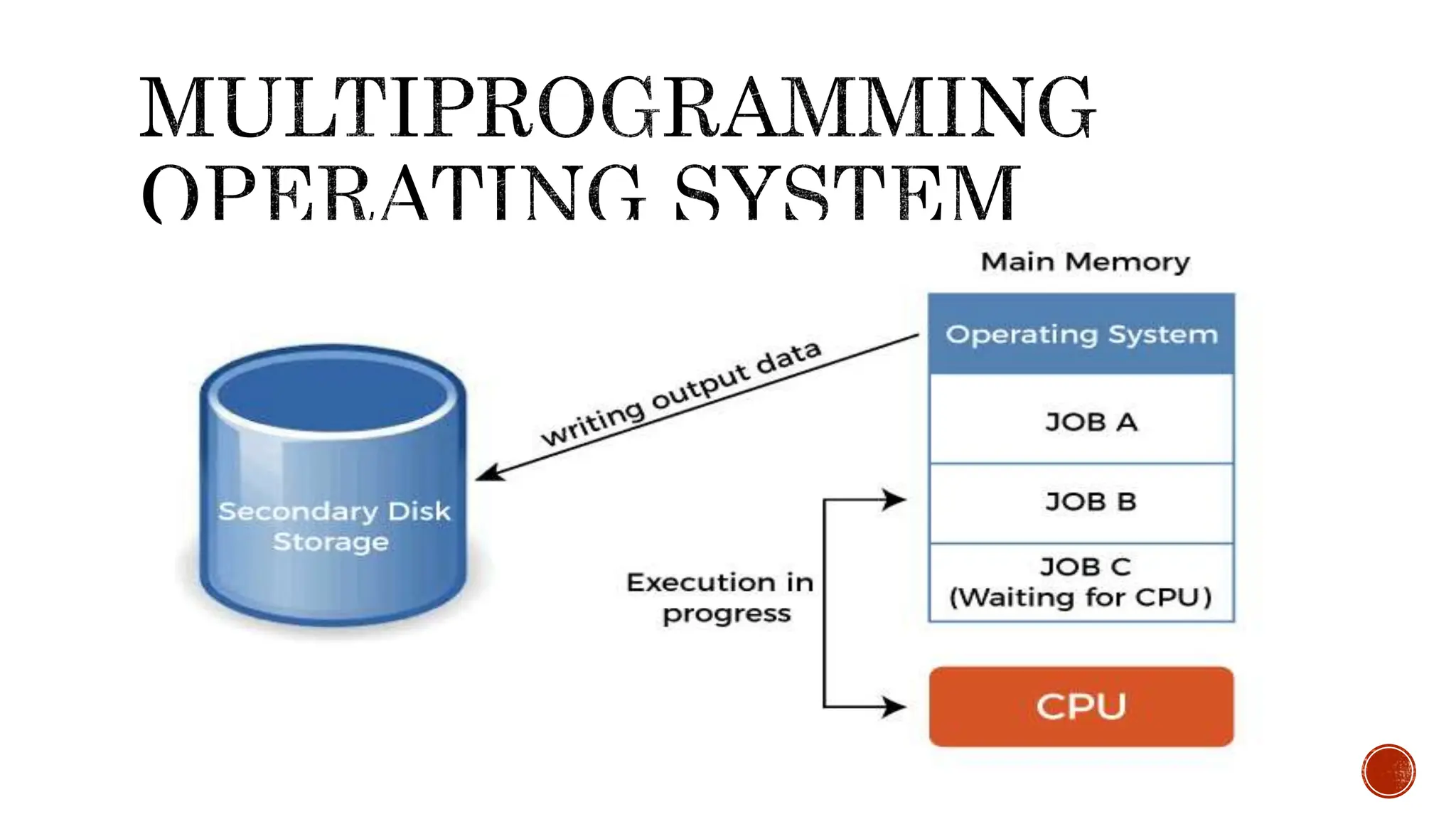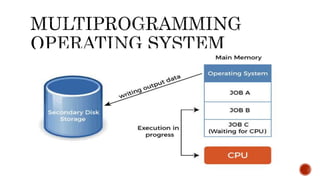 • #6 The primary goal of multiprogramming is to manage the entire system's resources. The key components of a multiprogramming system are the file system, command processor, transient area, and I/O control system. As a result, multiprogramming operating systems are designed to store different programs based on sub-segmenting parts of the transient area. The resource management routines are linked with the operating system core functions.