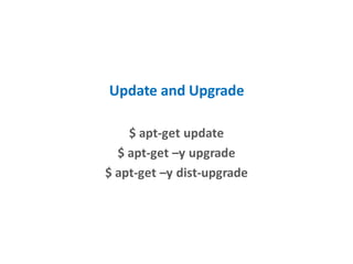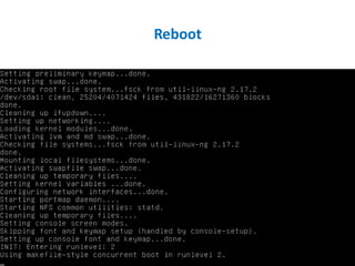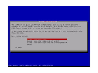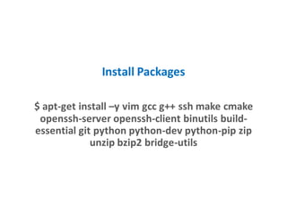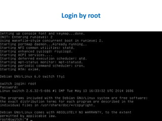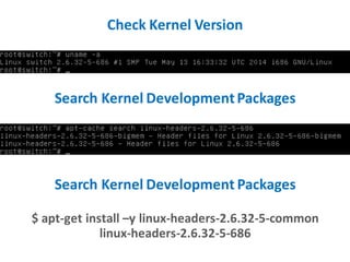 This document provides instructions for setting up a network development environment using a Debian virtual machine. It includes choosing a board and operating system, installing Debian in a VMware virtual machine, configuring virtual networks, developing and installing simple kernel modules to test network functionality, and modifying kernel modules to implement basic firewall rules.