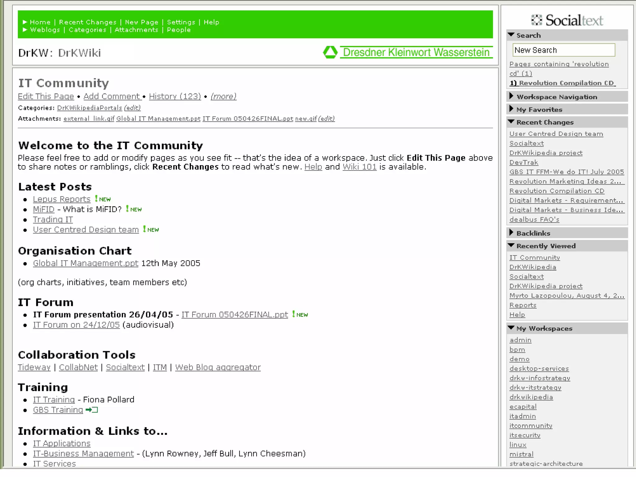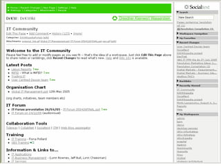 Socialtext is a wiki company with over 2,000 customers and $4.6 million in backing. Wikis allow groups to collaboratively edit websites where every page is editable. Wikis develop group memory and empower free association through hyperlinks. Many organizations are now using wikis internally to foster information sharing, build community, and align top-down and bottom-up processes.