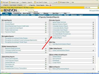 The document discusses how non-profits can use databases and the internet to build relationships and engage constituents. It provides tips on using tools like websites, email, social media and mobile applications to connect with supporters and raise funds. Benchmark reporting and analytics help measure success and compare performance to peer organizations. An integrated online and offline strategy is key to leveraging all available tools.