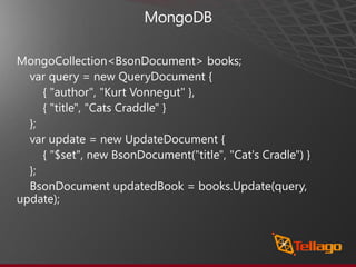 The document discusses how the database world is changing with the rise of NoSQL databases. It provides an overview of different categories of NoSQL databases like key-value stores, column-oriented databases, document databases, and graph databases. It also discusses how these NoSQL databases are being used with cloud computing platforms and how they are relevant for .NET developers.