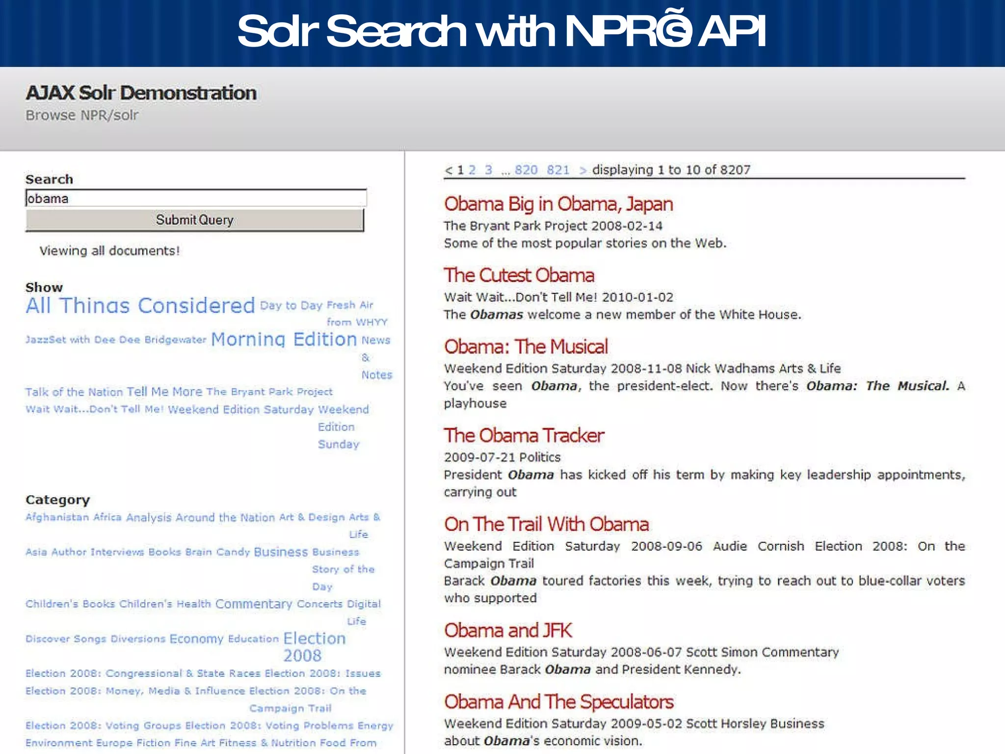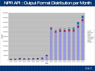 The document discusses the usage and metrics of the NPR API, showcasing the lifecycle of an NPR story from creation to distribution across various platforms. It includes examples of popular implementations and provides statistics on output format distribution and growth of requests. Additionally, it offers insights into non-NPRML output formats and related code libraries.