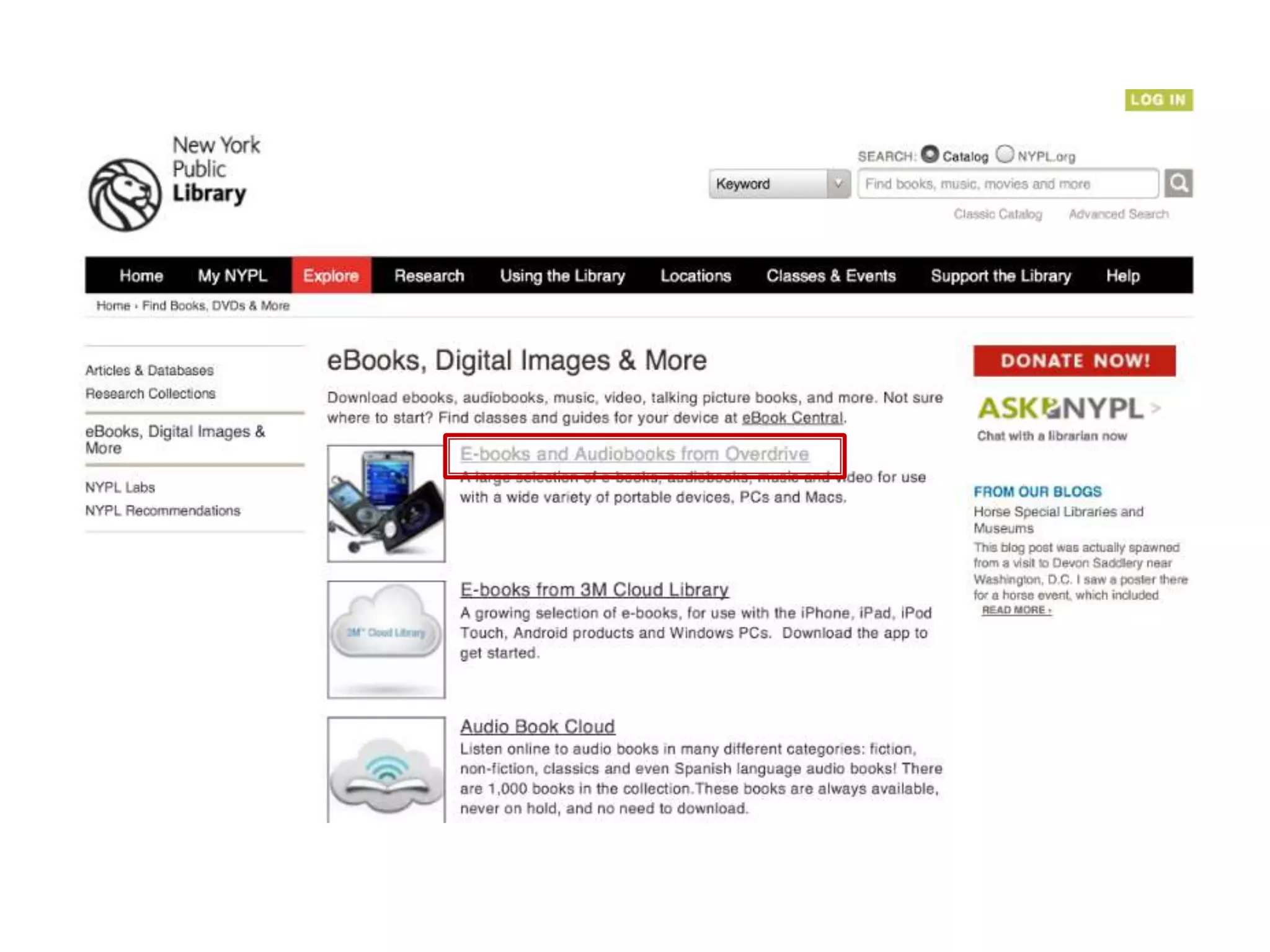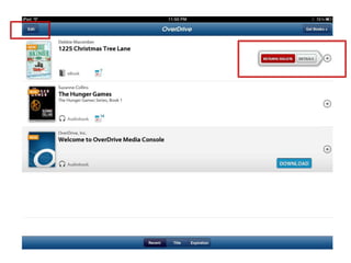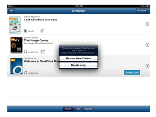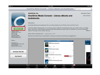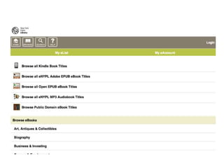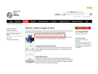 This document provides instructions for accessing eBooks and audiobooks from the New York Public Library using an iPad. It outlines that digital materials can be found at http://www.nypl.org/ebooks and accessed using the Overdrive app. The document recommends having an active library card and downloading the Overdrive app before browsing the digital collection, checking out titles, and accessing checked out materials on an iPad or through a web browser.