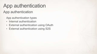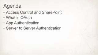 This document discusses SharePoint versions from 2007 to 2013 and describes two types of apps - SharePoint hosted apps, which store resources on the SharePoint server, and cloud hosted apps, which store resources remotely. It also shows how cloud hosted apps authenticate users through Windows Azure Access Control Service.