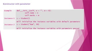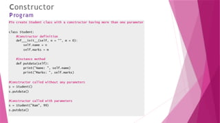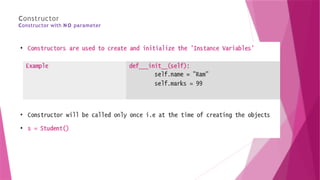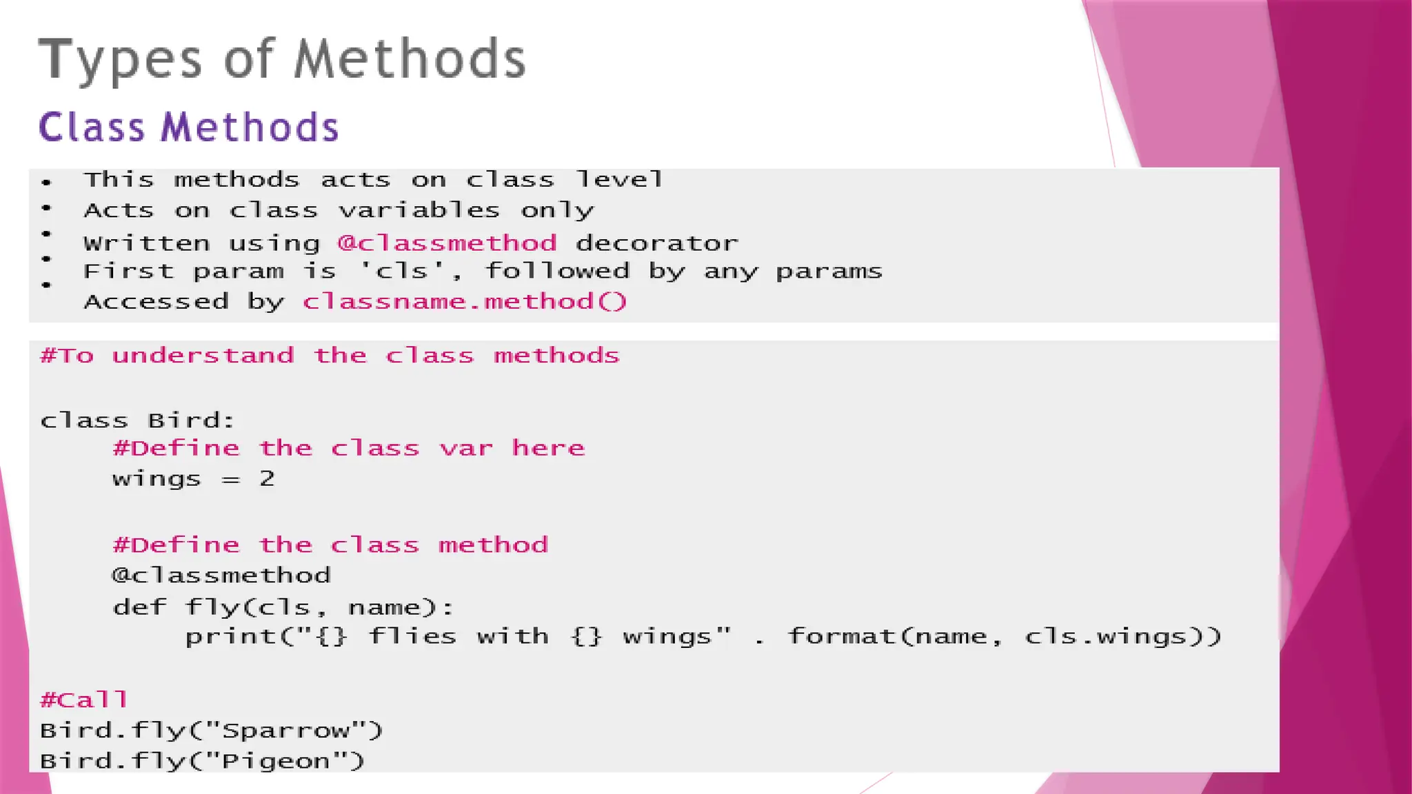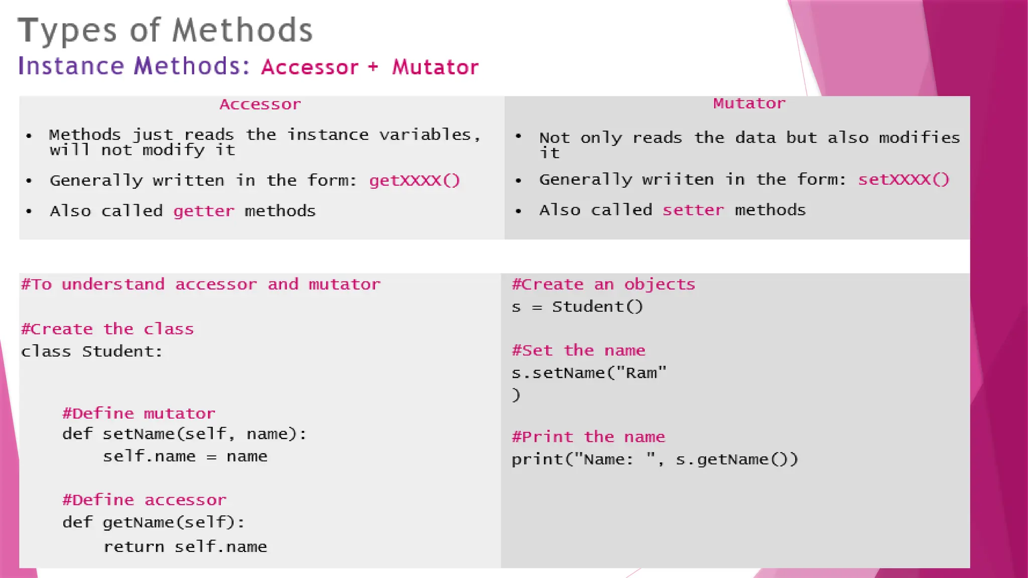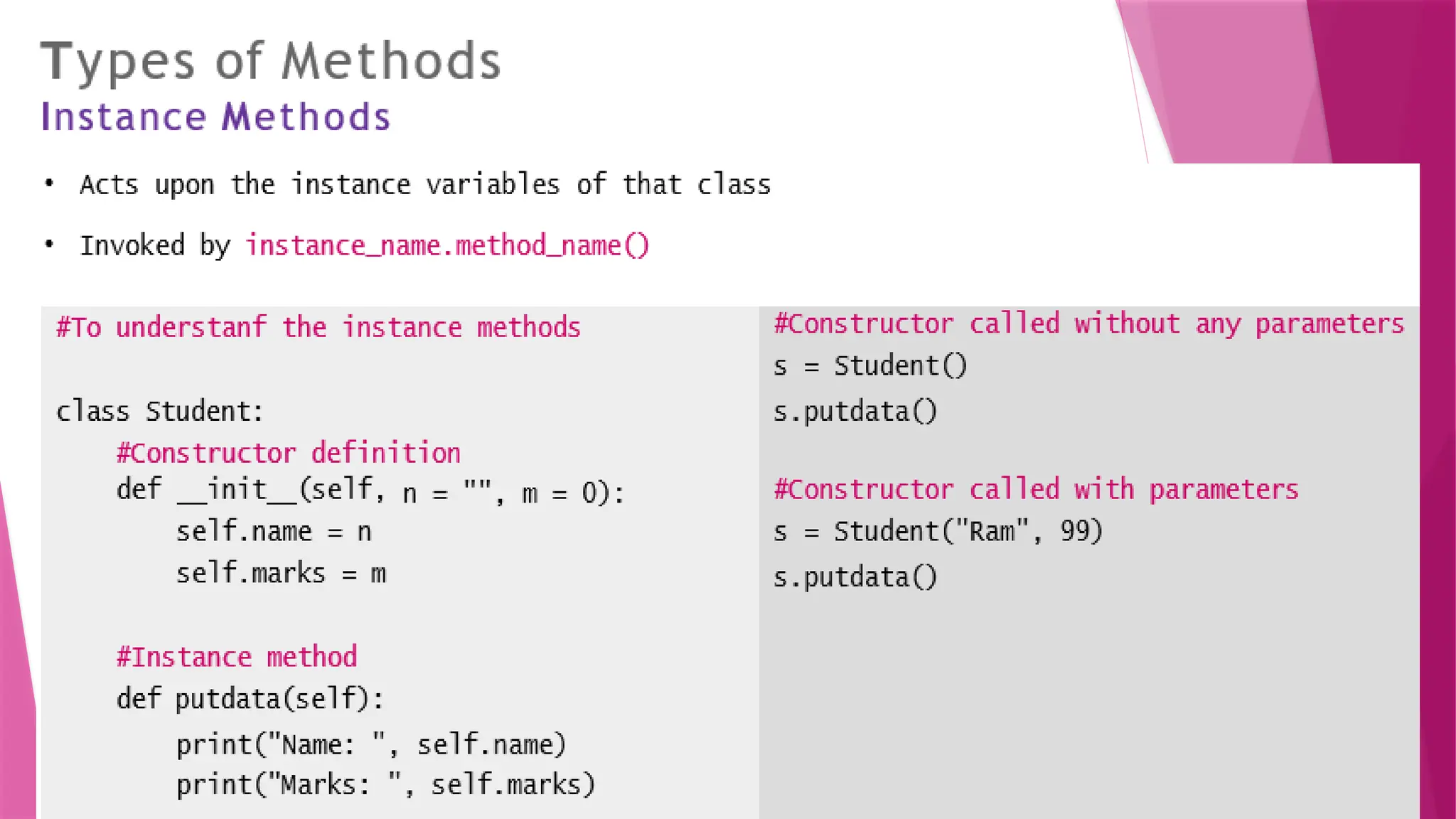▶ Methods are functions defined inside the body of a class. They are used to define the