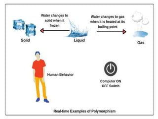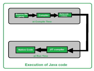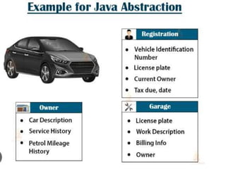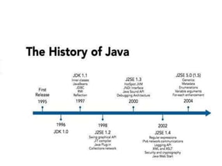 The document introduces Java programming concepts including object-oriented programming (OOP), classes, objects, inheritance, abstraction, encapsulation, and polymorphism. It provides examples of each concept in Java and compares features of Java and C++ such as memory management, multiple inheritance, and overloading. The document also outlines applications of Java and provides a basic Java program example.