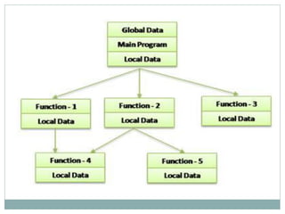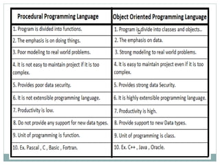 This document outlines the principles of Object-Oriented Programming (OOP) through C++ and contrasts it with Procedure-Oriented Programming (POP). OOP emphasizes data security, encapsulation, inheritance, polymorphism, dynamic binding, and message passing, which enhance maintainability and code reusability. Key concepts such as classes, objects, and data abstraction are explained, highlighting the advantages of OOP in real-world problem-solving.