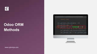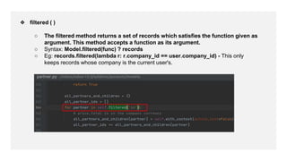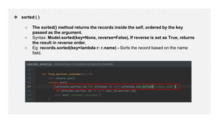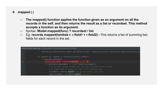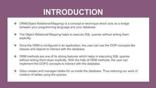 The document discusses Object Relational Mapping (ORM) in Odoo, highlighting its role as a bridge between programming languages and databases, allowing SQL queries to be executed without explicit writing. It explains various Odoo ORM methods, including sorted(), mapped(), and filtered(), detailing their syntax and usage with examples. Additionally, it mentions resources for further information, including blogs and videos related to Odoo.