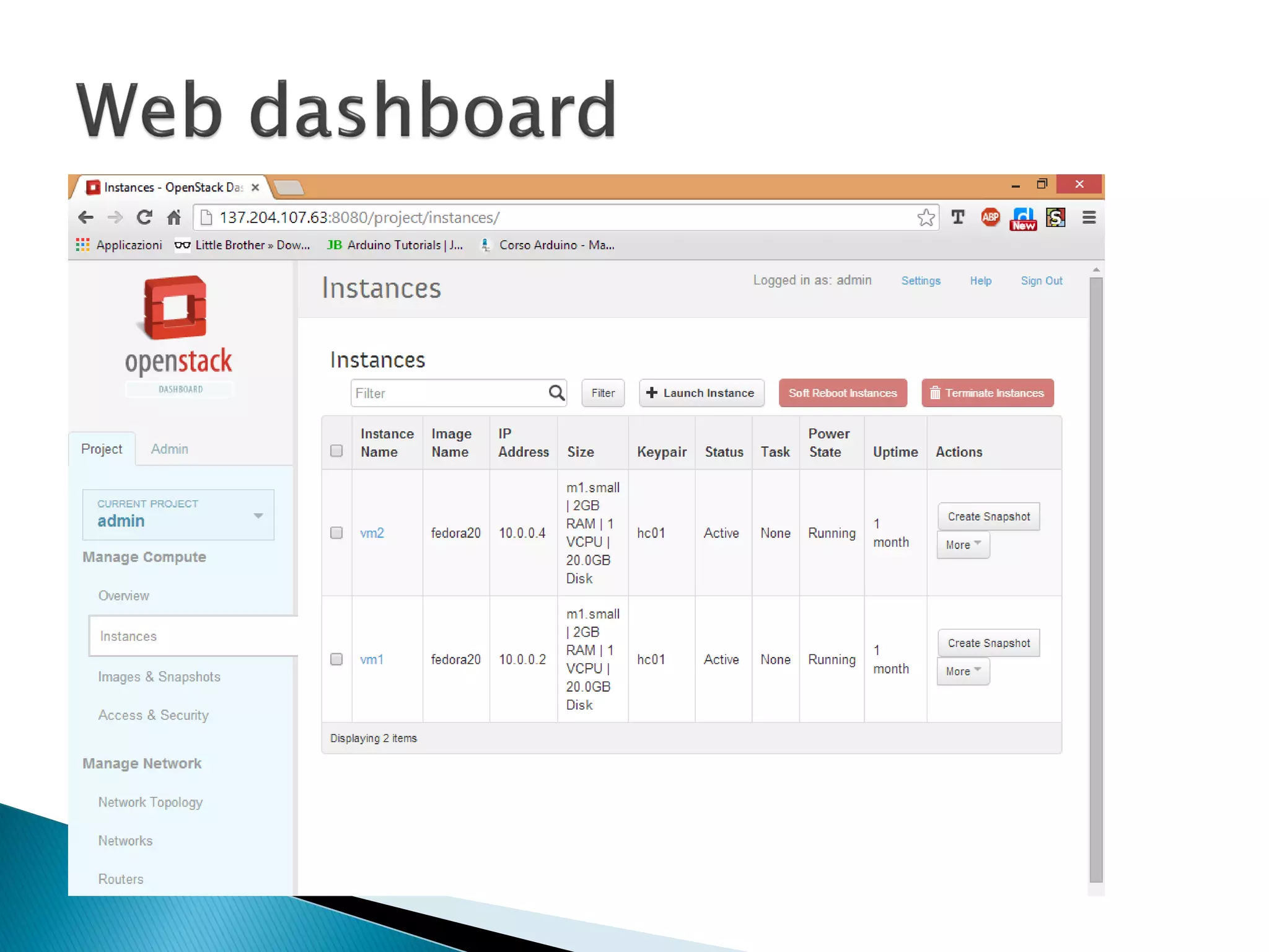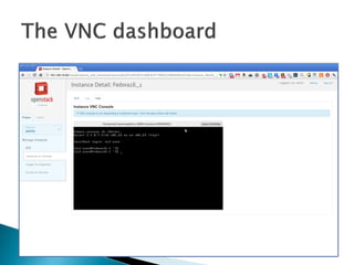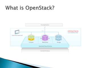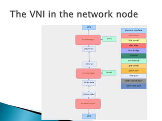 The document provides a comprehensive overview of OpenStack, a cloud platform management software, detailing its components such as Nova for compute management, Neutron for networking, and Cinder for storage. It explains how users can create virtual infrastructures using servers and network appliances, manage network namespaces for isolation, and the interactions between different OpenStack components through REST APIs. The architecture overview includes networking configurations and the implementation of virtual networks within the cloud environment.