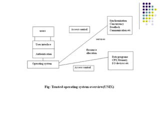 Vulnerabilities exist in operating systems like Linux, UNIX and Windows. A vulnerability is a weakness that allows an attacker to compromise a system's security. Vulnerabilities occur at the intersection of a system flaw, an attacker's access to the flaw, and their ability to exploit it. Common UNIX vulnerabilities include setuid problems, trojan horses and terminal troubles. Windows is vulnerable to password issues, peer-to-peer file sharing exploits, and Outlook/Outlook Express bugs. Linux has flaws like missing permission checks, uninitialized data, and memory mismanagement. Control is important for operating systems to balance robustness, predictability and efficiency. The trusted computing base (TCB) aims to enforce security by containing all elements