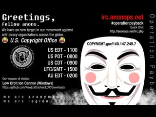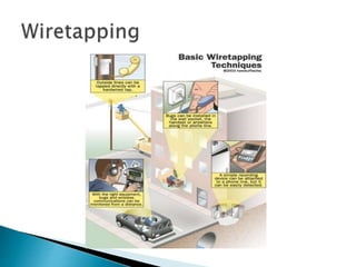 The document covers various aspects of cybersecurity, including operating system functionalities, types of attacks like denial-of-service (DoS) and distributed denial-of-service (DDoS), and different forms of malware such as viruses, worms, and trojans. It discusses specific incidents like the 'I Love You' worm and the Gh0st RAT trojan, along with the implications of the USA PATRIOT Act on surveillance and security. Additionally, it explores the evolution of wiretapping and cyber attacks against organizations, like those initiated by Bollywood against piracy.