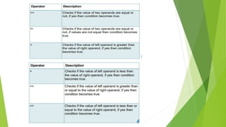 The document discusses the different types of operators in Java. It defines operators as symbols that operate on arguments to produce a result. It describes the different types of operands that operators can act on, such as numeric variables, primitive types, reference variables, and array elements. The document then lists and provides examples of the main types of operators in Java, including assignment, increment/decrement, arithmetic, bitwise, relational, logical, ternary, comma, and instanceof operators. It explains how each operator is used and provides simple code examples to illustrate their functionality.