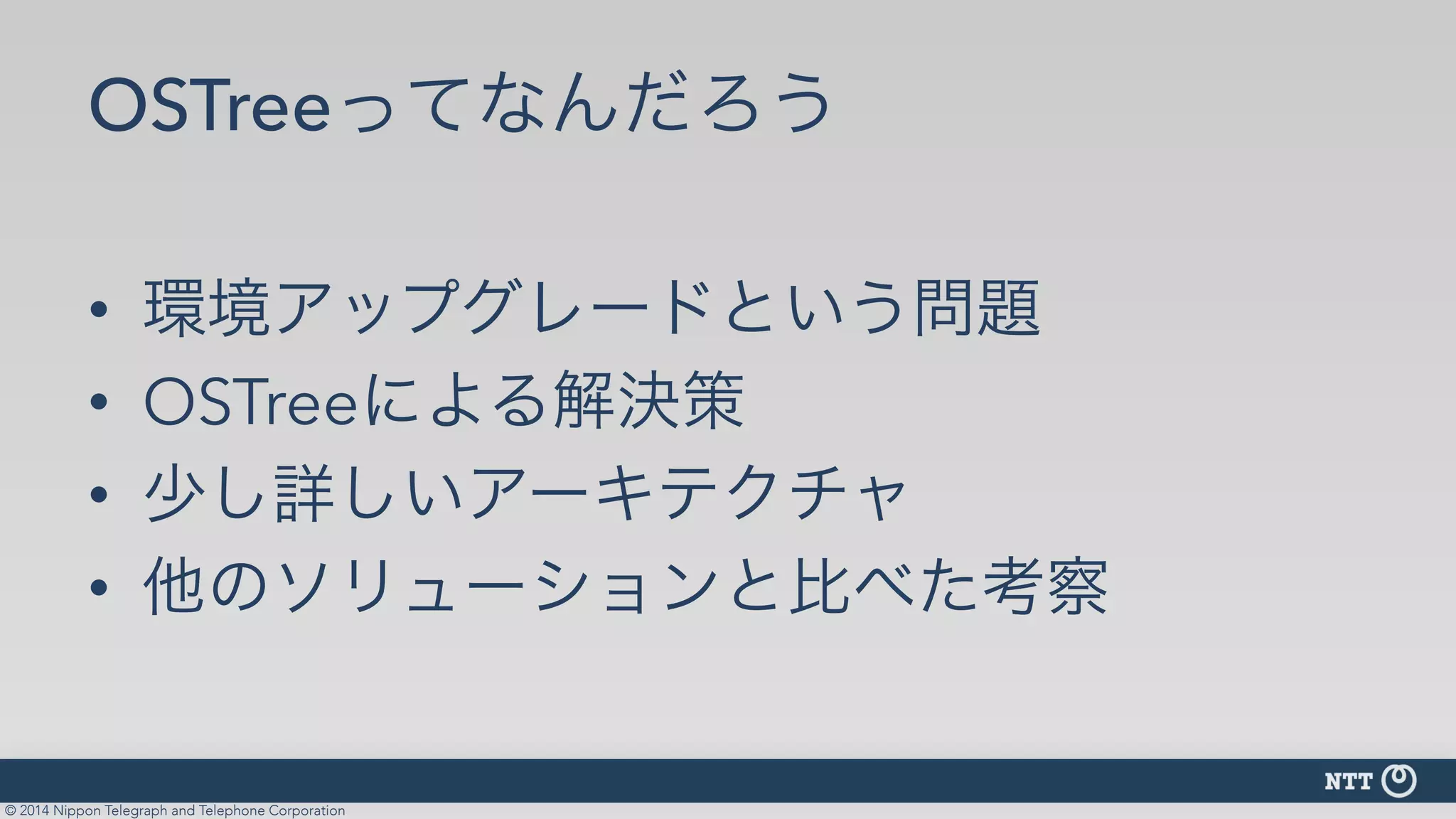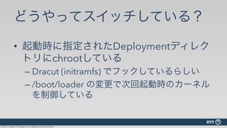 This document discusses OSTree, a system for deploying and managing operating system updates using Git-like technologies. It describes how OSTree works with Linux distributions and containers to provide atomic operating system updates using technologies like Git, Docker, and chroot. OSTree aims to provide fast, reliable operating system updates similar to technologies used in Chrome OS and CoreOS.