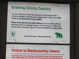 This document provides a summary of an 8-day hiking trip through Glacier National Park from August 9-17, 2009. Some of the hikes included trails to Avalanche Lake, Firebrand Pass, Red Rock Lake, Grinnell Glacier, and Iceberg Lake. Highlights included seeing quaking aspens, bear grass, wildflowers, views of glaciers and lakes, and wildlife sightings of bears and their cubs, minks, and other animals. The trip provided scenic hikes through varied terrain including subalpine meadows and glacial areas in peak wildflower season.