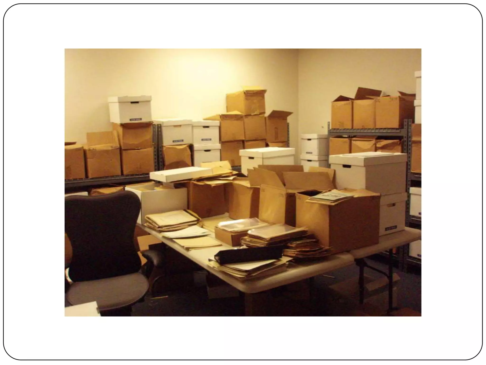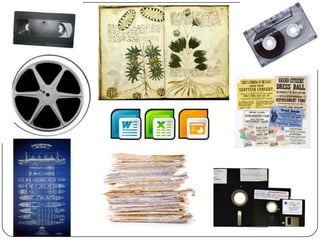 This document provides an overview of archival processing. It defines what an archive is and discusses the key responsibilities of an archivist, which include organizing, preserving, and providing access to archival materials. The document outlines important archival concepts like provenance, original order, appraisal, arrangement, description, and preservation. It also lists some fundamental books and internet resources for learning more about archival theory and practice. The document aims to give hands-on guidance for getting started with archival processing.