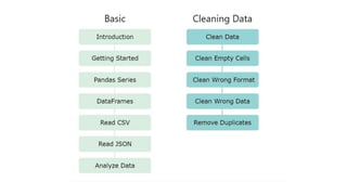 Pandas is a Python library used for working with datasets and analyzing data. It allows users to clean messy datasets, explore and manipulate data, and draw conclusions from large datasets based on statistical analysis. Pandas provides functions and methods for loading data from files like CSV and JSON files into DataFrames. DataFrames are the primary data structure in Pandas and act like a 2D spreadsheet with rows and columns. Users can view, clean, and analyze data in DataFrames to gain insights.