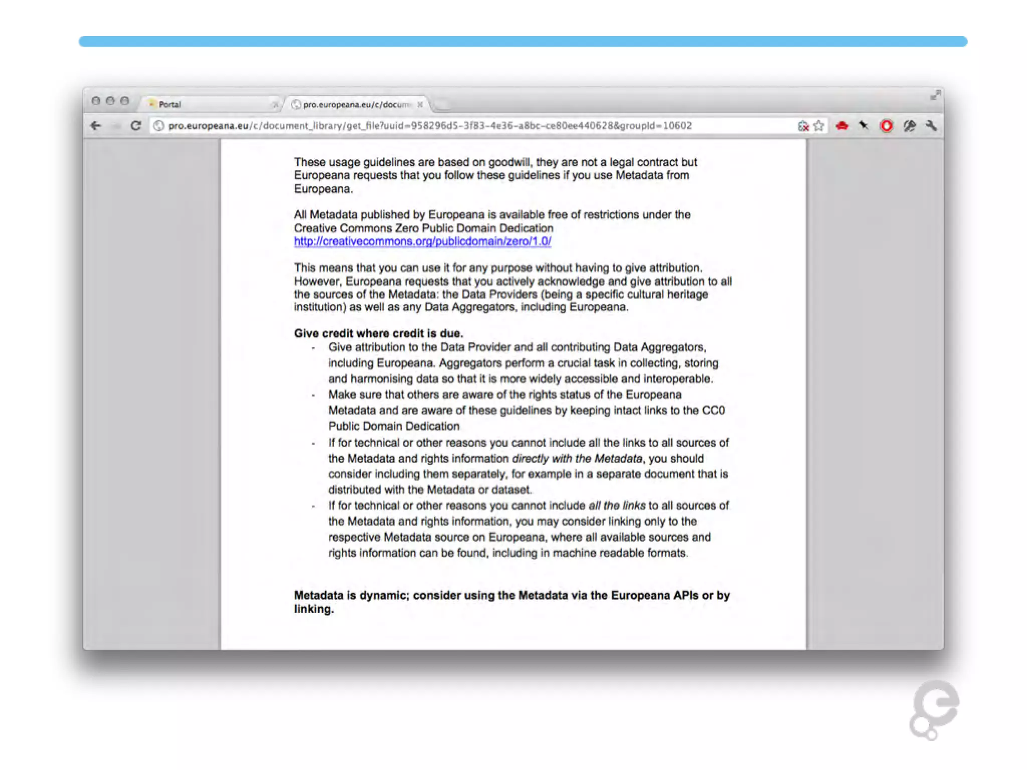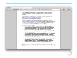 The document summarizes the Europeana Licensing Framework. It discusses three layers of information in Europeana - metadata, previews, and digital objects. Metadata and previews on Europeana can be used freely under CC0, while the actual digital objects remain on provider sites and are subject to individual rights statements. Providers are encouraged but not required to provide previews, and can opt out of having preview URLs published as linked open data. All metadata and previews will include attribution and links to usage guidelines.