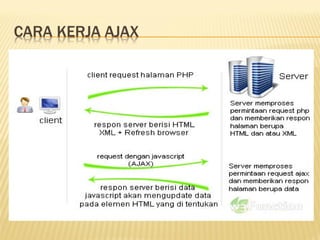 AJAX adalah teknik pengembangan web yang memungkinkan pertukaran data antara klien dan server tanpa harus me-refresh halaman web menggunakan JavaScript dan XMLHttpRequest. Ini membuat situs web menjadi lebih responsif dengan memperbarui konten secara dinamis tanpa reload halaman. Contoh aplikasi populer yang menggunakan AJAX adalah Facebook, Gmail dan Pinterest.