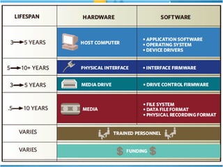 The document provides an overview of a workshop on developing and managing digital library and archive projects. It includes the workshop schedule, introductions from attendees, strategies for success, managing born-digital assets and digitized content, infrastructure requirements, and considerations for digital preservation over the long-term.