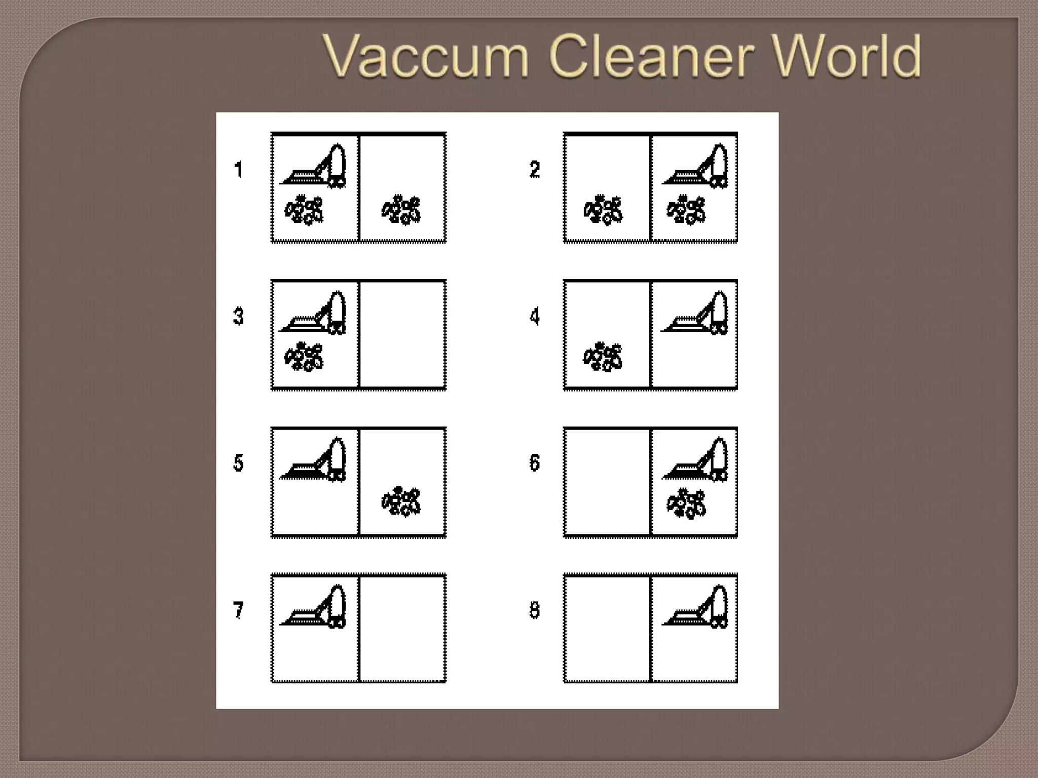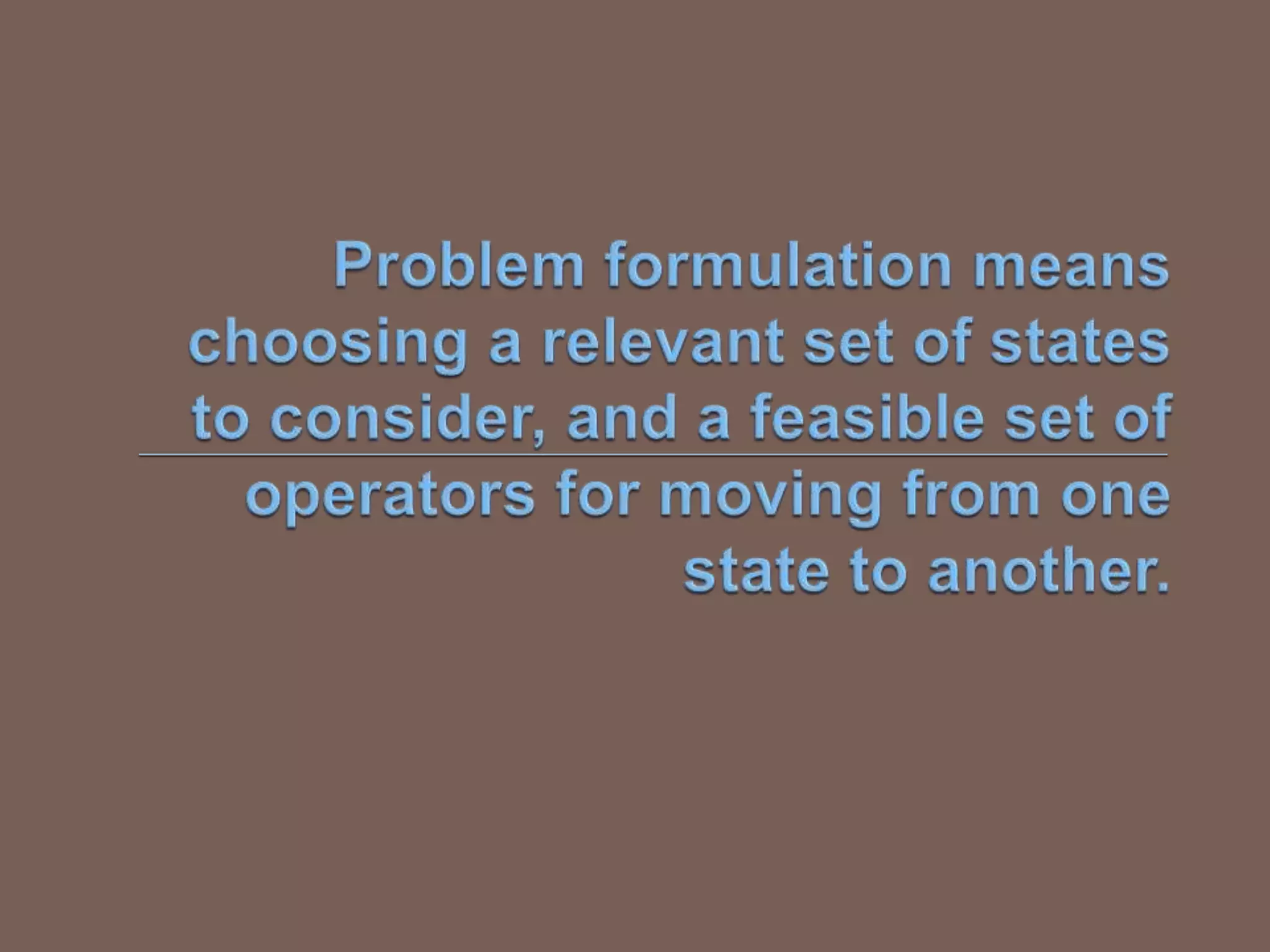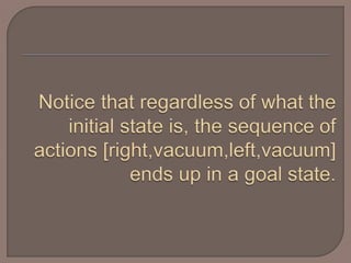  Goal formulation: intuitively, we want all the dirt cleaned up. Formally, the goal is { state 7, state 8 }.  Note that the { } notation indicates a set.  Problem formulation:  we already know what the set of all possible states is.  The operators are "move left", "move right", and "vacuum". 