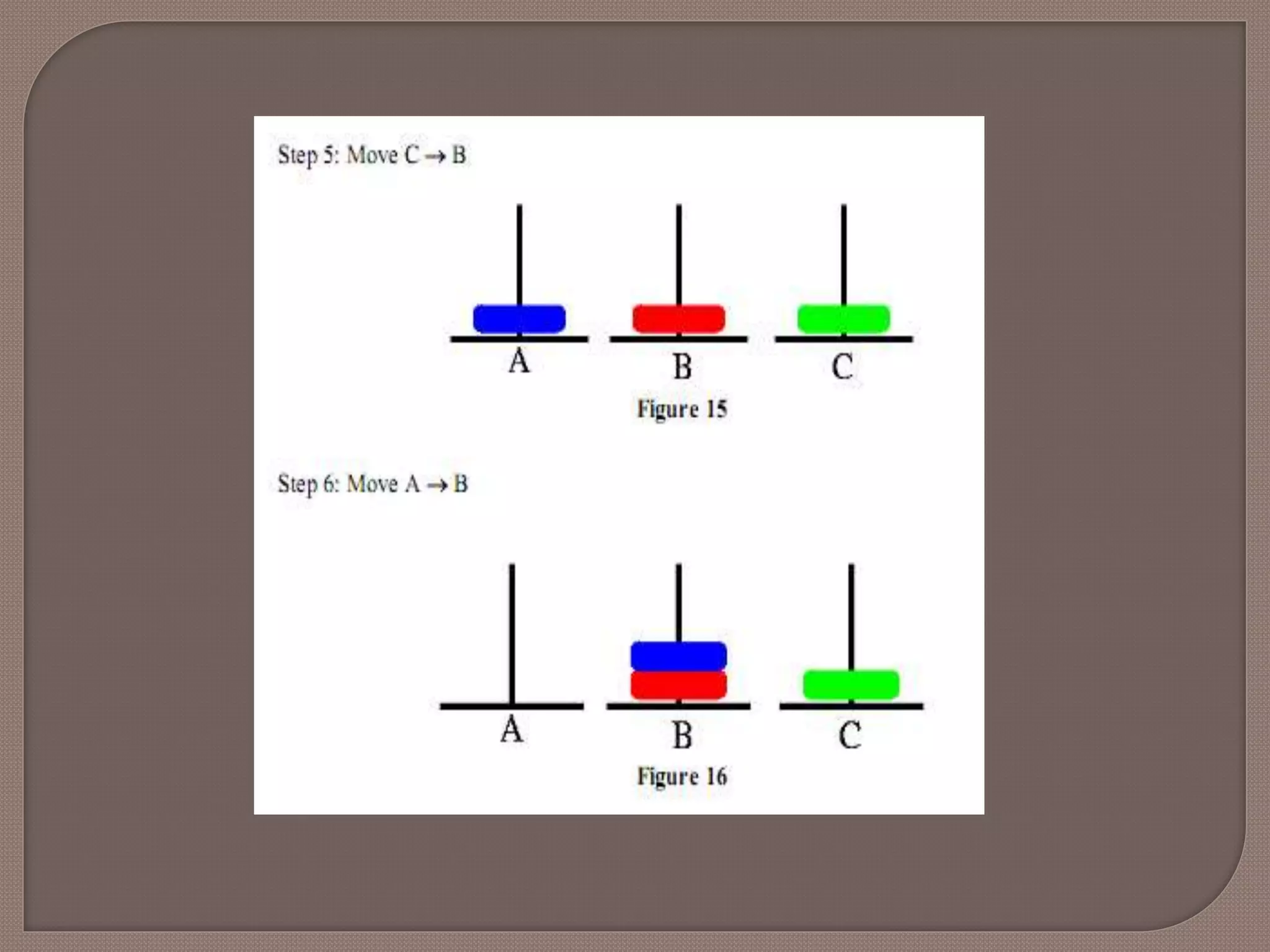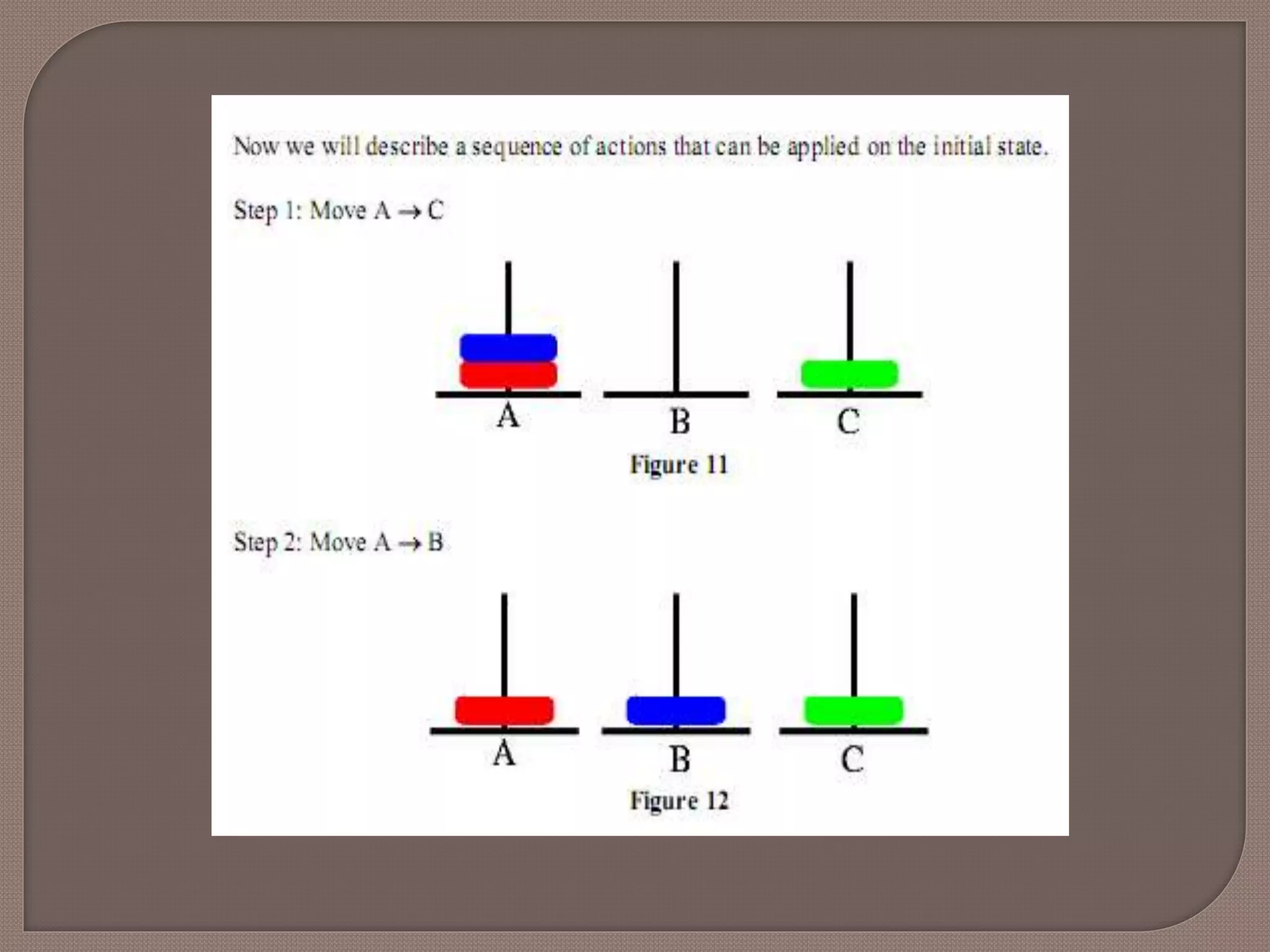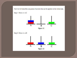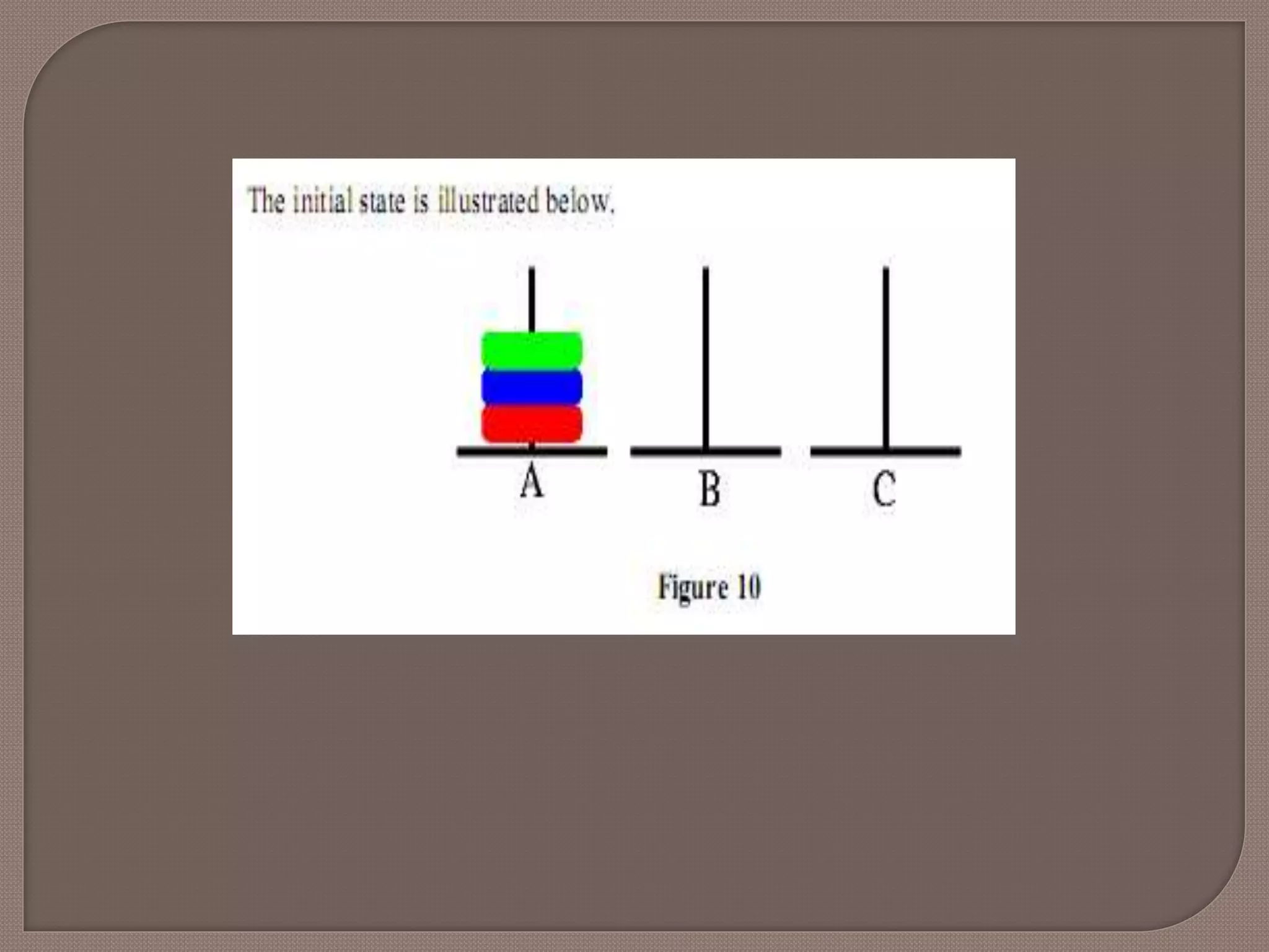 We have 3pegs and 3 disks. Operators: one may move the topmost disk on any needle to the topmost position to any other needle In the goal state all the pegs are in the needle B as shown in the figure below.