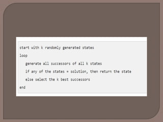 Otherwise the (initialk states and k number of successors of the states = 2k) states are placed in a pool. The pool is then sorted numerically. The highest k states are selected as new initial states. This process continues until a maximum value is reached. function BeamSearch( problem, k), returns a solution state.