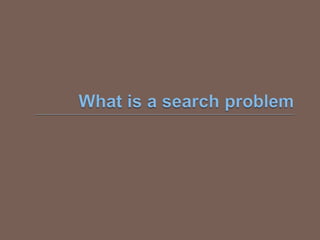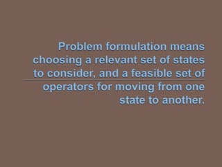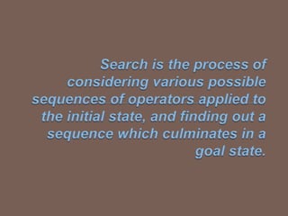  The searchproblem is to find a sequence of actions which transforms the agent from the  initial state to a goal state g∈G.  A search problem is represented by a 4-tuple {S, s , A, G}.  S: set of states  s ∈ S : initial state  A: S-> operators/ actions that transform one state to another state  G : goal, a set of states. G ⊆ S