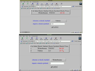 The document outlines the structure and functionalities of Java Servlets and Java Server Pages (JSP), including their history and key components. It provides code examples demonstrating basic servlet operations, client-server interactions, and handling HTTP requests via servlets and JSPs. Additionally, it discusses stock price retrieval through a servlet and uses JDBC for database connectivity in stock market applications.