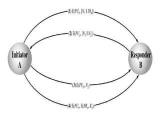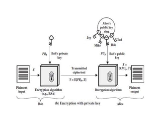 This document discusses the principles of public key cryptography. It begins by defining asymmetric encryption and how it uses a public key and private key instead of a single shared key. It then discusses key concepts like digital certificates and public key infrastructure. The document also provides examples of how public key cryptography can be used, including the RSA algorithm and key distribution methods like public key directories and certificates. It explains how public key cryptography solves the key distribution problem present in symmetric encryption.