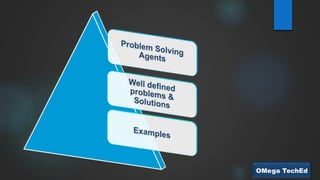 This document discusses problem solving agents in artificial intelligence. It explains that problem solving agents focus on satisfying goals by formulating the goal based on the current situation, then formulating the problem by determining the actions needed to achieve the goal. Key components of problem formulation include the initial state, possible actions, transition model describing how actions change the state, a goal test, and path cost function. Two examples of well-defined problems are given: the 8-puzzle problem and the 8-queens problem.