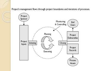 The document discusses the project life cycle and its phases. It begins by introducing systems development cycles and how projects fit within the first three phases of conception, definition, and execution. It then describes the typical phases a project passes through as initiation, planning, execution, monitoring/controlling, and closing. Finally, it explains the significance of segmenting projects into phases and how it allows for management of work, resources, deliverables, costs, and risks throughout the project.