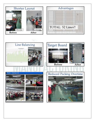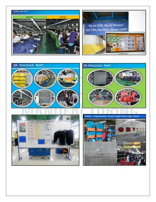 The document proposes a "Compliance & Lean Manufacturing System" program to help manufacturers improve efficiency, reduce costs and waste, and meet customer demands. The Compliance & Lean Practice Center team aims to replace outdated factory management with lean techniques through intensive training programs. The training would focus on lean manufacturing, quality assurance, industrial engineering and more. It would be conducted by two trainers experienced in lean implementation, auditing, and management systems with the goals of improving productivity, reducing defects and inventory, and establishing good compliance practices.