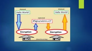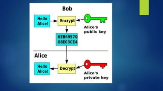 Public key algorithms like RSA and ElGamal allow for secure encryption without a shared private key. RSA uses a public and private key pair generated from large prime numbers such that a message encrypted with the public key can only be decrypted by the corresponding private key. It is widely used due to its security being based on the difficulty of factoring large numbers, though it is less efficient than symmetric algorithms due to involving modular exponentiation. ElGamal also uses a public/private key approach and its security relies on the discrete logarithm problem.