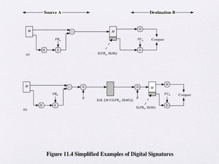 Digital Signature • Operationis similar to that of the MAC • The hash value of a message is encrypted with a user’s private key • Anyone who knows the user’s public key can verify the integrity of the message • An attacker who wishes to alter the message would need to know the user’s private key • Implications of digital signatures go beyond just message authentication