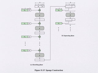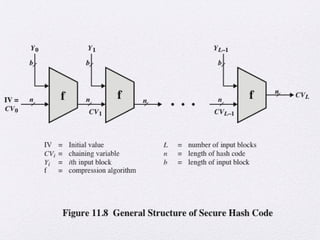 Two Simple HashFunctions • Consider two simple insecure hash functions that operate using the following general principles: • The input is viewed as a sequence of n-bit blocks • The input is processed one block at a time in an iterative fashion to produce an n-bit hash function • Bit-by-bit exclusive-OR (XOR) of every block • Ci = bi1 xor bi2 xor . . . xor bim • Produces a simple parity for each bit position and is known as a longitudinal redundancy check • Reasonably effective for random data as a data integrity check • Perform a one-bit circular shift on the hash value after each block is processed • Has the effect of randomizing the input more completely and overcoming any regularities that appear in the input