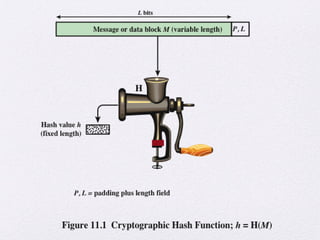 Hash Functions • Ahash function H accepts a variable-length block of data M as input and produces a fixed-size hash value • h = H(M) • Principal object is data integrity • Cryptographic hash function • An algorithm for which it is computationally infeasible to find either: (a) a data object that maps to a pre-specified hash result (the one-way property) (b) two data objects that map to the same hash result (the collision-free property)