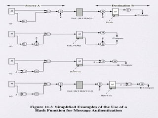 Other Hash FunctionUses Commonly used to create a one-way password file When a user enters a password, the hash of that password is compared to the stored hash value for verification This approach to password protection is used by most operating systems Can be used for intrusion and virus detection Store H(F) for each file on a system and secure the hash values One can later determine if a file has been modified by recomputing H(F) An intruder would need to change F without changing H(F) Can be used to construct a pseudorandom function (PRF) or a pseudorandom number generator (PRNG) A common application for a hash-based PRF is for the generation of symmetric keys