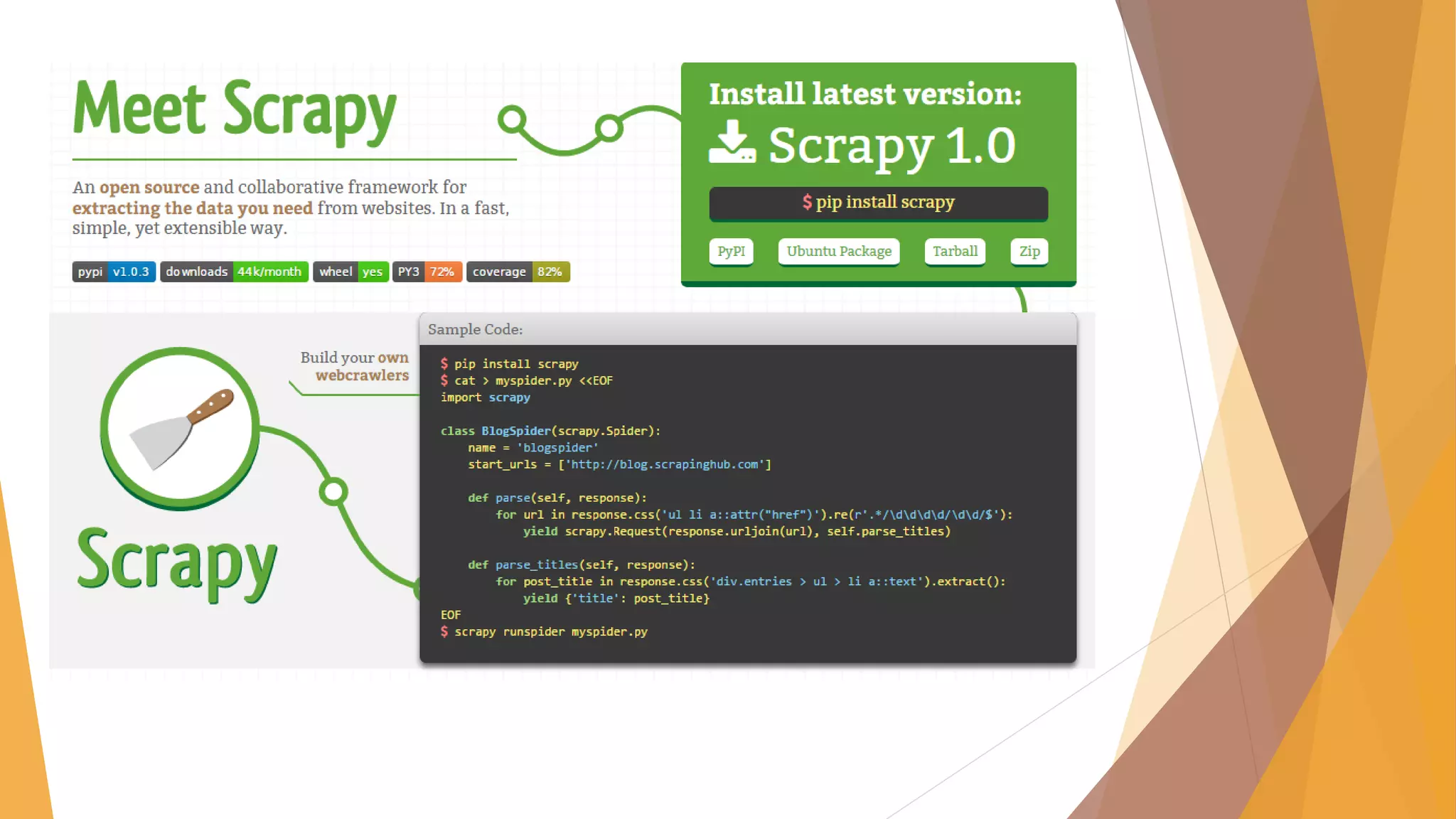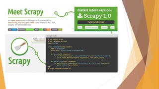 Python tools for webscraping provides an overview of scraping techniques like screen scraping, report mining, and web scraping using spiders and crawlers. It then demonstrates various Python libraries for web scraping including Selenium, Requests, Beautiful Soup, PyQuery, Scrapy, and Scrapy Cloud. The document shows how to scrape data from websites using these tools and techniques.